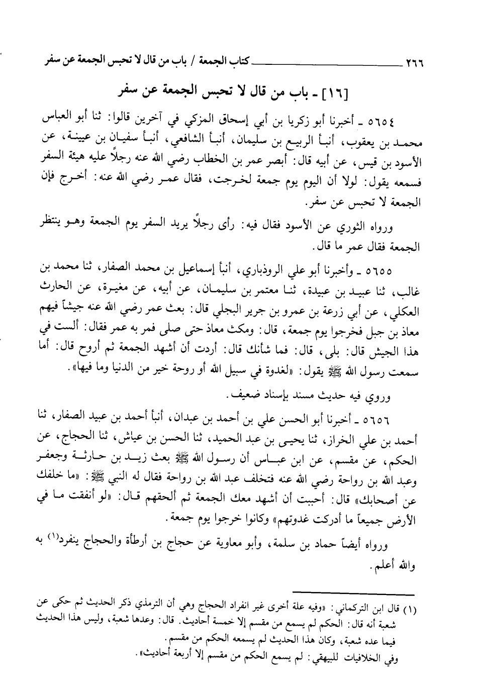 5654 - أَخْبَرَنَا أَبُو زَكَرِيَّا بْنُ أَبِي إِسْحَاقَ الْمُزَكِّي فِي آخَرِينَ قَالُوا: ثنا أَبُو الْعَبَّاسِ مُحَمَّدُ بْنُ يَعْقُوبَ أنبأ الرَّبِيعُ بْنُ سُلَيْمَانَ، أنبأ الشَّافِعِيُّ، أنبأ سُفْيَانُ بْنُ عُيَيْنَةَ، عَنِ الْأَسْوَدِ بْنِ قَيْسٍ، عَنْ أَبِيهِ، قَالَ: أَبْصَرَ عُمَرُ بْنُ الْخَطَّابِ رَضِيَ اللهُ عَنْهُ رَجُلًا عَلَيْهِ هَيْئَةُ السَّفَرِ، فَسَمِعَهُ يَقُولُ: لَوْلَا أَنَّ الْيَوْمَ يَوْمُ جُمُعَةٍ لَخَرَجْتُ، فَقَالَ عُمَرُ رَضِيَ اللهُ عَنْهُ: §" اخْرُجْ فَإِنَّ الْجُمُعَةَ لَا تَحْبِسُ عَنْ سَفَرٍ ". وَرَوَاهُ الثَّوْرِيُّ عَنِ الْأَسْوَدِ فَقَالَ فِيهِ: رَأَى رَجُلًا يُرِيدُ السَّفَرَ يَوْمَ الْجُمُعَةِ وَهُوَ يَنْتَظِرُ الْجُمُعَةَ، فَقَالَ عُمَرُ مَا قَالَ