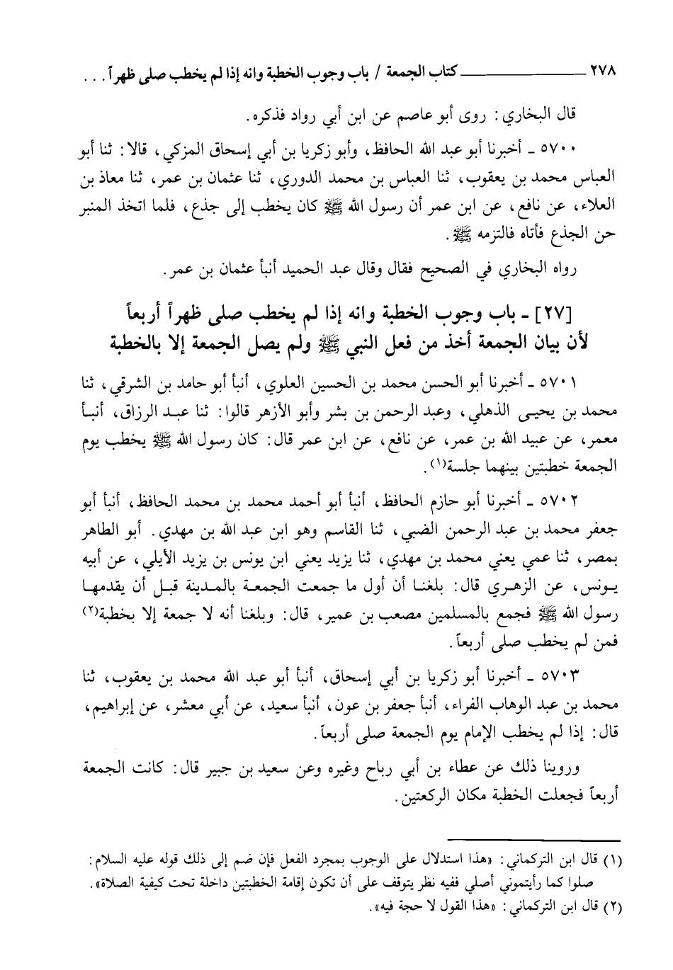 5701 - أَخْبَرَنَا أَبُو الْحَسَنِ مُحَمَّدُ بْنُ الْحُسَيْنِ الْعَلَوِيُّ أنبا أَبُو حَامِدِ بْنُ الشَّرْقِيِّ، ثنا مُحَمَّدُ بْنُ يَحْيَى الذُّهْلِيُّ، وَعَبْدُ الرَّحْمَنِ بْنُ بِشْرٍ، وَأَبُو الْأَزْهَرِ قَالُوا: ثنا عَبْدُ الرَّزَّاقِ، أنبأ مَعْمَرٌ، عَنْ عُبَيْدِ اللهِ بْنِ عُمَرَ، عَنْ نَافِعٍ، عَنِ ابْنِ عُمَرَ قَالَ: §" كَانَ رَسُولُ اللهِ صَلَّى اللهُ عَلَيْهِ وَسَلَّمَ يَخْطُبُ يَوْمَ الْجُمُعَةِ خُطْبَتَيْنِ بَيْنَهُمَا جِلْسَةٌ "