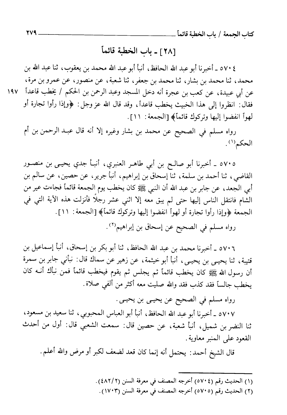 5705 - أَخْبَرَنَا أَبُو صَالِحِ بْنُ أَبِي طَاهِرٍ الْعَنْبَرِيُّ، أنبا جَدِّي يَحْيَى بْنُ مَنْصُورٍ الْقَاضِي، ثنا أَحْمَدُ بْنُ سَلَمَةَ، ثنا إِسْحَاقُ بْنُ إِبْرَاهِيمَ، أنبأ جَرِيرٌ، عَنْ حُصَيْنٍ، عَنْ سَالِمِ بْنِ أَبِي الْجَعْدِ، عَنْ جَابِرِ بْنِ عَبْدِ اللهِ: " أَنَّ النَّبِيَّ صَلَّى اللهُ عَلَيْهِ وَسَلَّمَ كَانَ يَخْطُبُ يَوْمَ الْجُمُعَةِ قَائِمًا، فَجَاءَتْ عِيرٌ مِنَ الشَّامِ فَانْتَقَلَ النَّاسُ إِلَيْهَا حَتَّى لَمْ يَبْقَ مَعَهُ إِلَّا اثْنَا عَشَرَ رَجُلًا، فَأُنْزِلَتْ هَذِهِ الْآيَةُ الَّتِي فِي الْجُمُعَةِ {§وَإِذَا رَأَوْا تِجَارَةً أَوْ لَهْوًا انْفَضُّوا إِلَيْهَا وَتَرَكُوكَ قَائِمًا} [الجمعة: 11] ". رَوَاهُ مُسْلِمٌ فِي الصَّحِيحِ، عَنْ إِسْحَاقَ بْنِ إِبْرَاهِيمَ