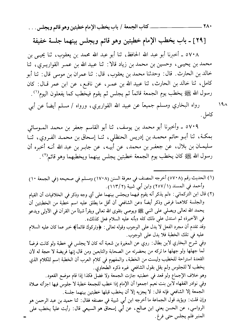 5708 - أَخْبَرَنَا أَبُو عَبْدِ اللهِ الْحَافِظُ، ثنا أَبُو عَبْدِ اللهِ مُحَمَّدُ بْنُ يَعْقُوبَ ثنا يَحْيَى بْنُ مُحَمَّدِ بْنِ يَحْيَى، وَحُسَيْنُ بْنُ مُحَمَّدِ بْنِ زِيَادٍ قَالَا: ثنا عُبَيْدُ اللهِ بْنُ عُمَرَ الْقَوَارِيرِيُّ، ثنا خَالِدُ بْنُ الْحَارِثِ قَالَ: وَحَدَّثَنَا مُحَمَّدُ بْنُ يَعْقُوبَ قَالَ: ثنا عِمْرَانُ بْنُ مُوسَى قَالَ: ثنا أَبُو كَامِلٍ، ثنا خَالِدُ بْنُ الْحَارِثِ، ثنا عُبَيْدُ اللهِ بْنُ عُمَرَ، عَنْ نَافِعٍ، عَنِ ابْنِ عُمَرَ قَالَ: §" كَانَ رَسُولُ اللهِ صَلَّى اللهُ عَلَيْهِ وَسَلَّمَ يَخْطُبُ يَوْمَ الْجُمُعَةِ قَائِمًا ثُمَّ يَجْلِسُ، ثُمَّ يَقُومُ فَيَخْطُبُ كَمَا يَفْعَلُونَ الْيَوْمَ ". رَوَاهُ الْبُخَارِيُّ، وَمُسْلِمٌ، جَمِيعًا عَنْ عُبَيْدِ اللهِ الْقَوَارِيرِيِّ، وَرَوَاهُ مُسْلِمٌ، أَيْضًا عَنْ أَبِي كَامِلٍ