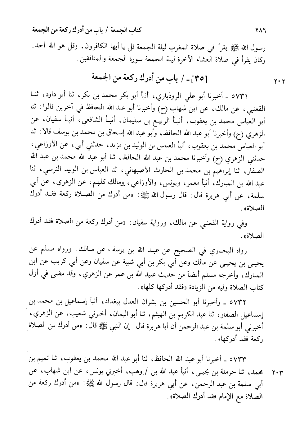 5731 - أَخْبَرَنَا أَبُو عَلِيٍّ الرُّوذْبَارِيُّ، أنبأ أَبُو بَكْرٍ مُحَمَّدُ بْنُ بَكْرٍ، ثنا أَبُو دَاوُدَ، ثنا الْقَعْنَبِيُّ، عَنْ مَالِكٍ، عَنِ ابْنِ شِهَابٍ، ح وَأَخْبَرَنَا أَبُو عَبْدِ اللهِ الْحَافِظُ فِي آخَرِينَ قَالُوا: ثنا أَبُو الْعَبَّاسِ مُحَمَّدُ بْنُ يَعْقُوبَ، أنبأ الرَّبِيعُ بْنُ سُلَيْمَانَ، أنبا الشَّافِعِيُّ، أنبأ سُفْيَانُ، عَنِ الزُّهْرِيِّ، ح وَأَخْبَرَنَا أَبُو عَبْدِ اللهِ الْحَافِظُ، وَأَبُو عَبْدِ اللهِ إِسْحَاقُ بْنُ مُحَمَّدِ بْنِ يُوسُفَ قَالَا: ثنا أَبُو الْعَبَّاسِ مُحَمَّدُ بْنُ يَعْقُوبَ، أنبأ الْعَبَّاسُ بْنُ الْوَلِيدِ بْنِ مَزْيَدَ، حَدَّثَنِي أَبِي، عَنِ الْأَوْزَاعِيِّ، حَدَّثَنِي الزُّهْرِيُّ، ح وَأَخْبَرَنَا مُحَمَّدُ بْنُ عَبْدِ اللهِ الْحَافِظُ، ثنا أَبُو عَبْدِ اللهِ مُحَمَّدُ بْنُ عَبْدِ اللهِ الصَّفَّارُ، ثنا إِبْرَاهِيمُ بْنُ مُحَمَّدِ بْنِ الْحَارِثِ الْأَصْبَهَانِيُّ، ثنا الْعَبَّاسُ بْنُ الْوَلِيدِ النَّرْسِيُّ، ثنا عَبْدُ اللهِ بْنُ الْمُبَارَكِ، أنبأ مَعْمَرٌ، وَيُونُسُ، وَالْأَوْزَاعِيُّ، وَمَالِكٌ، كُلُّهُمْ عَنِ الزُّهْرِيِّ، عَنْ أَبِي سَلَمَةَ، عَنْ أَبِي هُرَيْرَةَ قَالَ: قَالَ رَسُولُ اللهِ صَلَّى اللهُ عَلَيْهِ وَسَلَّمَ: §" مَنْ أَدْرَكَ مِنَ الصَّلَاةِ رَكْعَةً فَقَدْ أَدْرَكَ الصَّلَاةَ ". وَفِي رِوَايَةِ الْقَعْنَبِيِّ، عَنْ مَالِكٍ، وَرِوَايَةِ سُفْيَانَ: " مَنْ أَدْرَكَ رَكْعَةً مِنَ الصَّلَاةِ فَقَدْ أَدْرَكَ الصَّلَاةَ ". رَوَاهُ الْبُخَارِيُّ فِي الصَّحِيحِ، عَنْ عَبْدِ اللهِ بْنِ يُوسُفَ، عَنْ مَالِكٍ، وَرَوَاهُ مُسْلِمٌ، عَنْ يَحْيَى بْنِ يَحْيَى، عَنْ مَالِكٍ، وَعَنْ أَبِي بَكْرِ بْنِ أَبِي شَيْبَةَ، عَنْ سُفْيَانَ، وَعَنْ أَبِي كُرَيْبٍ، عَنِ ابْنِ الْمُبَارَكِ، وَأَخْرَجَهُ مُسْلِمٌ أَيْضًا مِنْ حَدِيثِ عُبَيْدِ اللهِ بْنِ عُمَرَ، عَنِ الزُّهْرِيِّ، وَقَدْ مَضَى فِي أَوَّلِ كِتَابِ الصَّلَاةِ، وَفِيهِ مِنَ الزِّيَادَةِ " فَقَدْ أَدْرَكَهَا كُلَّهَا "