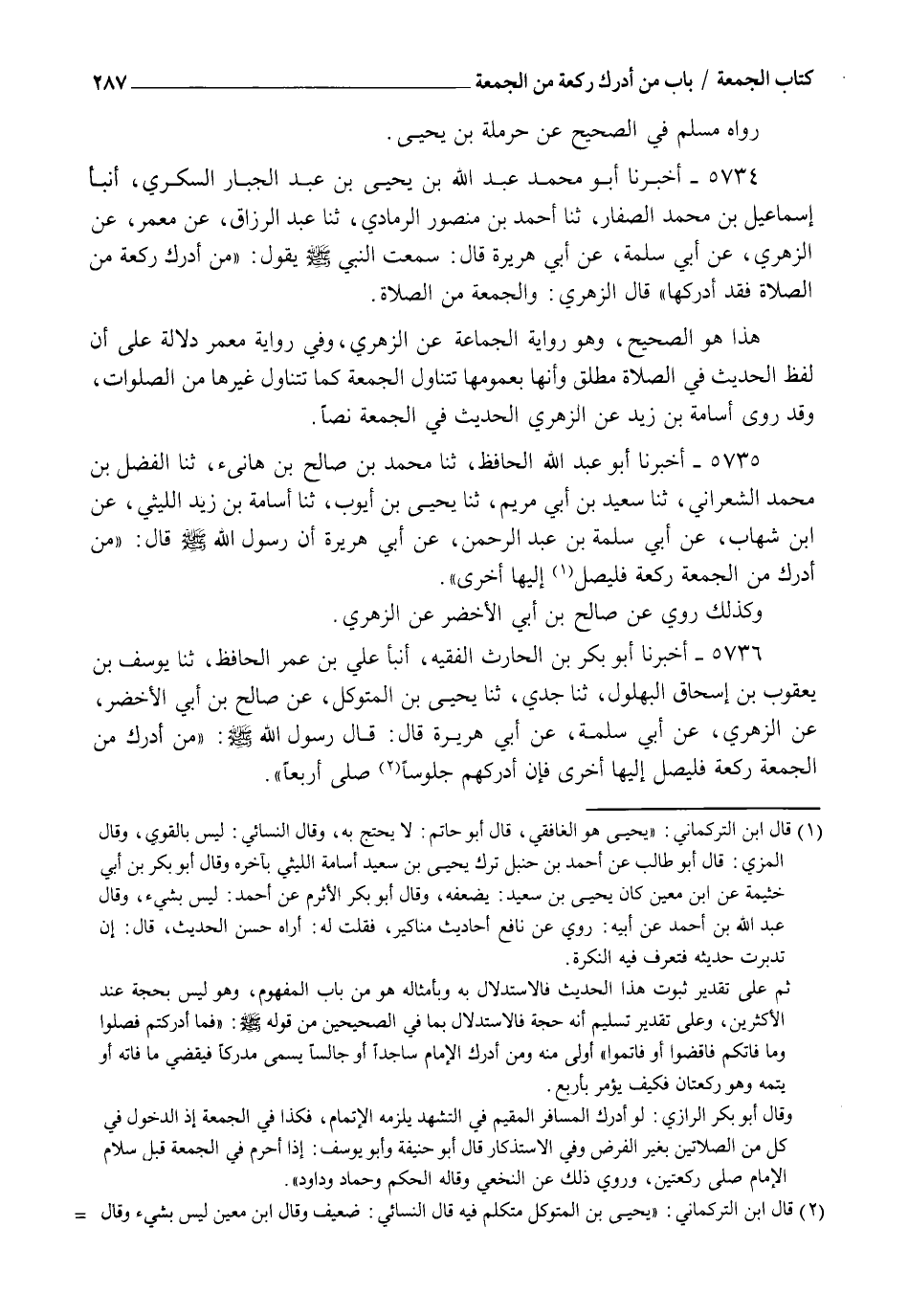 5736 - أَخْبَرَنَا أَبُو بَكْرِ بْنُ الْحَارِثِ الْفَقِيهُ، أنبأ عَلِيُّ بْنُ عُمَرَ الْحَافِظُ، ثنا يُوسُفُ بْنُ يَعْقُوبَ بْنِ إِسْحَاقَ الْبَهْلُولُ، ثنا جَدِّي، ثنا يَحْيَى بْنُ الْمُتَوَكِّلِ، عَنْ صَالِحِ بْنِ أَبِي الْأَخْضَرِ، عَنِ الزُّهْرِيِّ، عَنْ أَبِي سَلَمَةَ، عَنْ أَبِي هُرَيْرَةَ قَالَ: قَالَ رَسُولُ اللهِ صَلَّى اللهُ عَلَيْهِ وَسَلَّمَ: " §مَنْ أَدْرَكَ مِنَ الْجُمُعَةِ رَكْعَةً، فَلْيُصَلِّ إِلَيْهَا أُخْرَى، فَإِنْ أَدْرَكَهُمْ جُلُوسًا صَلَّى أَرْبَعًا ". -[288]- وَرُوِيَ ذَلِكَ مِنْ أَوْجُهٍ أُخَرَ عَنِ الزُّهْرِيِّ. قَدْ ذَكَرْنَاهَا فِي الْخِلَافِ، وَرُوِيَ عَنْ أَبِي صَالِحٍ عَنْ أَبِي هُرَيْرَةَ مِنْ قَوْلِهِ مَوْقُوفًا عَلَيْهِ