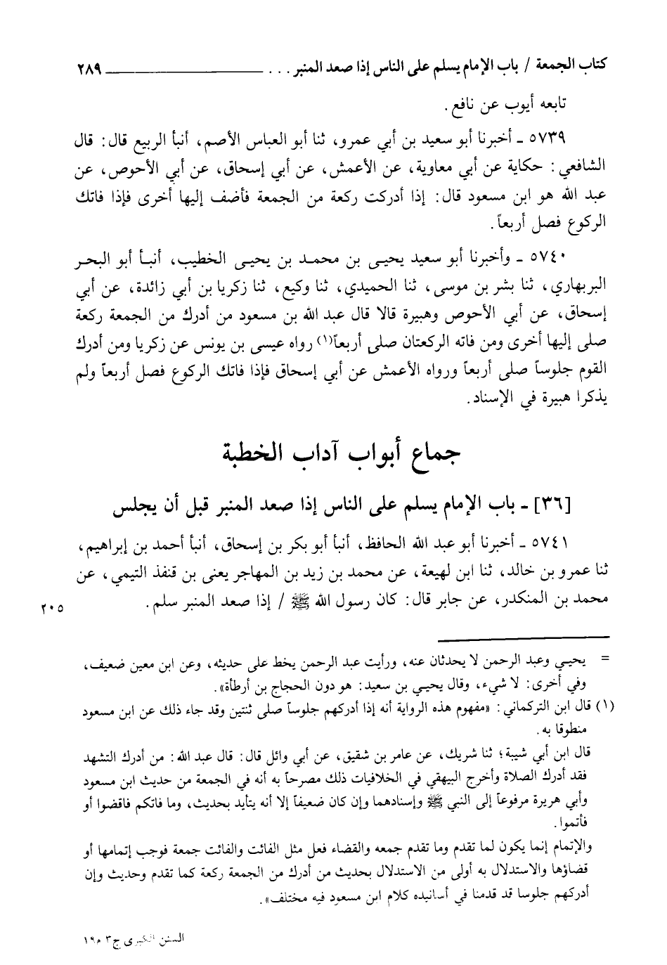 5740 - وَأَخْبَرَنَا أَبُو سَعِيدٍ يَحْيَى بْنُ مُحَمَّدِ بْنِ يَحْيَى الْخَطِيبُ، أنبأ أَبُو الْبَحْرِ الْبَرْبَهَارِيُّ، ثنا بِشْرُ بْنُ مُوسَى، ثنا الْحُمَيْدِيُّ، ثنا وَكِيعٌ، ثنا زَكَرِيَّا بْنُ أَبِي زَائِدَةَ، عَنْ أَبِي إِسْحَاقَ، عَنْ أَبِي الْأَحْوَصِ، وَهُبَيْرَةَ قَالَا: قَالَ عَبْدُ اللهِ بْنُ مَسْعُودٍ: " §مَنْ أَدْرَكَ مِنَ الْجُمُعَةِ رَكْعَةً صَلَّى إِلَيْهَا أُخْرَى، وَمَنْ فَاتَهُ الرَّكْعَتَانِ صَلَّى أَرْبَعًا ". رَوَاهُ عِيسَى بْنُ يُونُسَ عَنْ زَكَرِيَّا، " وَمَنْ أَدْرَكَ الْقَوْمَ جُلُوسًا صَلَّى أَرْبَعًا ". وَرَوَاهُ الْأَعْمَشُ عَنْ أَبِي إِسْحَاقَ: " فَإِذَا فَاتَكَ الرُّكُوعُ فَصَلِّ أَرْبَعًا ". وَلَمْ يَذْكُرَا هُبَيْرَةَ فِي الْإِسْنَادِ