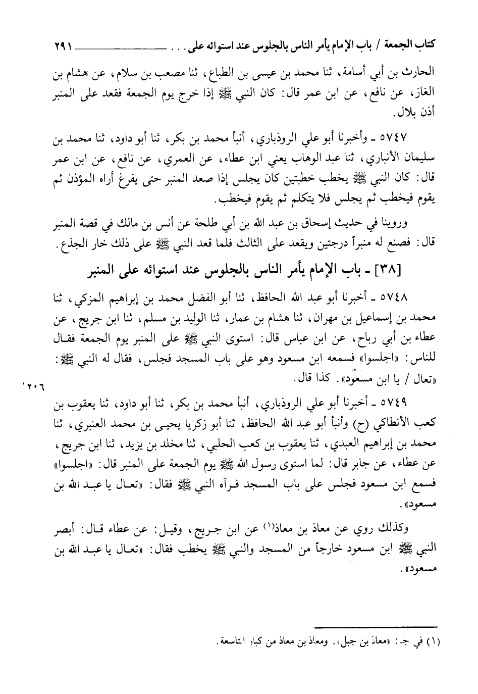 5748 - أَخْبَرَنَا أَبُو عَبْدِ اللهِ الْحَافِظُ، ثنا أَبُو الْفَضْلِ مُحَمَّدُ بْنُ إِبْرَاهِيمَ الْمُزَكِّي، ثنا مُحَمَّدُ بْنُ إِسْمَاعِيلَ بْنِ مِهْرَانَ، ثنا هِشَامُ بْنُ عَمَّارٍ، ثنا الْوَلِيدُ بْنُ مُسْلِمٍ، ثنا ابْنُ جُرَيْجٍ، عَنْ عَطَاءِ بْنِ أَبِي رَبَاحٍ، عَنِ ابْنِ عَبَّاسٍ قَالَ: " اسْتَوَى النَّبِيُّ صَلَّى اللهُ عَلَيْهِ وَسَلَّمَ عَلَى الْمِنْبَرِ يَوْمَ الْجُمُعَةِ فَقَالَ لِلنَّاسِ: " اجْلِسُوا " فَسَمِعَهُ ابْنُ مَسْعُودٍ وَهُوَ عَلَى بَابِ الْمَسْجِدِ فَجَلَسَ، فَقَالَ لَهُ النَّبِيُّ صَلَّى اللهُ عَلَيْهِ وَسَلَّمَ: §" تَعَالَ يَا ابْنَ مَسْعُودٍ " كَذَا قَالَ "
