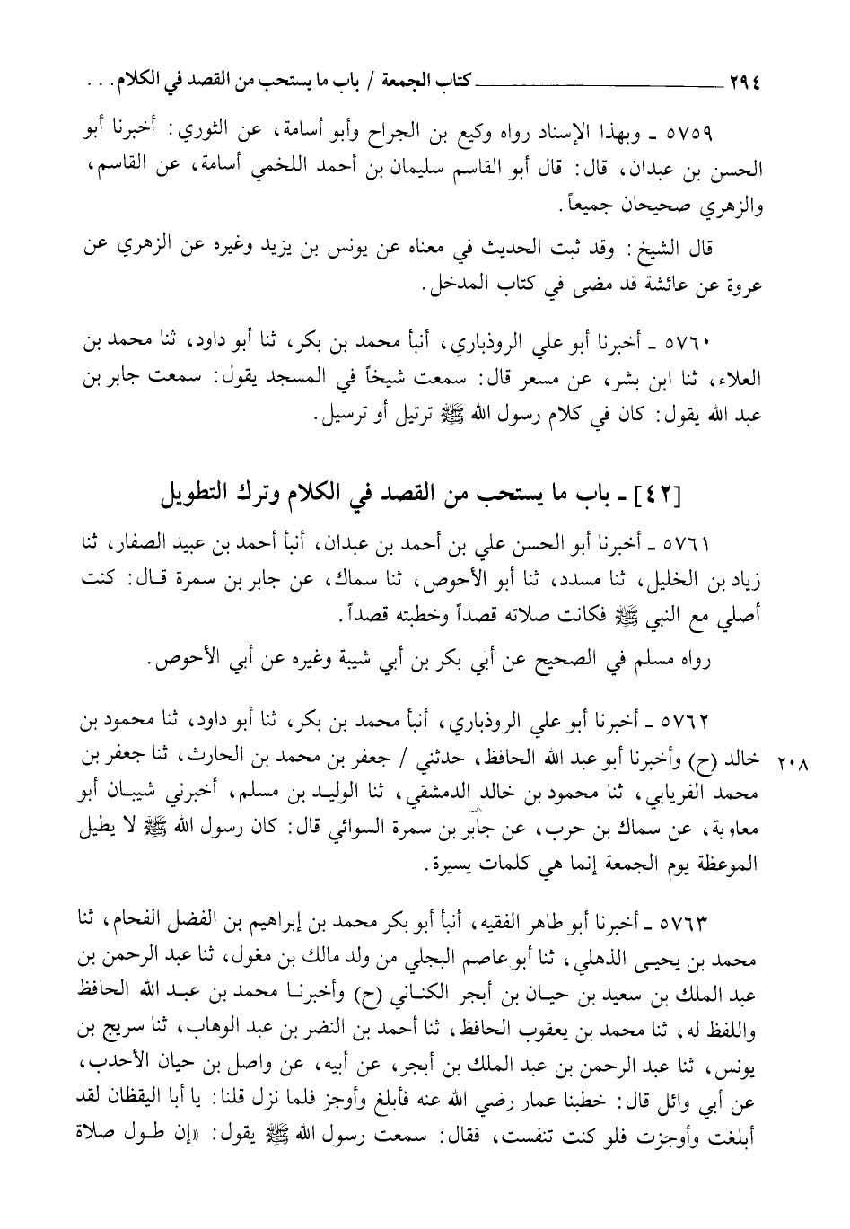5761 - أَخْبَرَنَا أَبُو الْحَسَنِ عَلِيُّ بْنُ أَحْمَدَ بْنِ عَبْدَانَ، أنبأ أَحْمَدُ بْنُ عُبَيْدٍ الصَّفَّارُ، ثنا زِيَادُ بْنُ الْخَلِيلِ، ثنا مُسَدَّدٌ، ثنا أَبُو الْأَحْوَصِ، ثنا سِمَاكٌ، عَنْ جَابِرِ بْنِ سَمُرَةَ قَالَ: " كُنْتُ أُصَلِّي مَعَ النَّبِيِّ صَلَّى اللهُ عَلَيْهِ وَسَلَّمَ §فَكَانَتْ صَلَاتُهُ قَصْدًا وَخُطْبَتُهُ قَصْدًا ". رَوَاهُ مُسْلِمٌ فِي الصَّحِيحِ، عَنْ أَبِي بَكْرِ بْنِ أَبِي شَيْبَةَ، وَغَيْرِهِ عَنْ أَبِي الْأَحْوَصِ