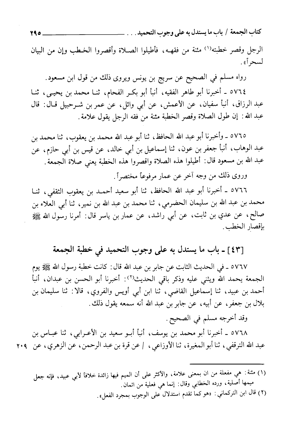 5764 - أَخْبَرَنَا أَبُو طَاهِرٍ الْفَقِيهُ، أنبأ أَبُو بَكْرٍ الْفَحَّامُ، ثنا مُحَمَّدُ بْنُ يَحْيَى، ثنا عَبْدُ الرَّزَّاقِ، أنبا سُفْيَانُ، عَنِ الْأَعْمَشِ، عَنْ أَبِي وَائِلٍ، عَنْ عُمَرَ بْنِ شُرَحْبِيلَ قَالَ: قَالَ عَبْدُ اللهِ: " إِنَّ §طُولَ الصَّلَاةِ وَقِصَرَ الْخُطْبَةِ مَئِنَّةٌ مِنْ فِقْهِ الرَّجُلِ ". يَقُولُ: عَلَامَةٌ