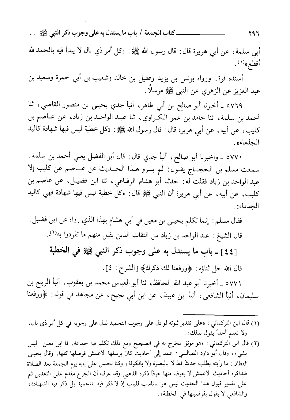 5770 - وَأَخْبَرَنَا أَبُو صَالِحٍ، أنبأ جَدِّي قَالَ: قَالَ أَبُو الْفَضْلِ يَعْنِي أَحْمَدَ بْنَ سَلَمَةَ: سَمِعْتُ مُسْلِمَ بْنَ الْحَجَّاجِ يَقُولُ: لَمْ يَرْوِ هَذَا الْحَدِيثَ عَنْ عَاصِمٍ، عَنْ كُلَيْبٍ إِلَّا عَبْدُ الْوَاحِدِ بْنُ زِيَادٍ، فَقُلْتُ لَهُ: حَدَّثَنَا أَبُو هِشَامٍ الرِّفَاعِيُّ، ثنا ابْنُ فُضَيْلٍ، عَنْ عَاصِمِ بْنِ كُلَيْبٍ، عَنْ أَبِيهِ، عَنْ أَبِي هُرَيْرَةَ، أَنَّ النَّبِيَّ صَلَّى اللهُ عَلَيْهِ وَسَلَّمَ قَالَ: §" كُلُّ خُطْبَةٍ لَيْسَ فِيهَا شَهَادَةٌ فَهِيَ كَالْيَدِ الْجَذْمَاءِ ". فَقَالَ مُسْلِمٌ: إِنَّمَا تَكَلَّمَ يَحْيَى بْنُ مَعِينٍ فِي أَبِي هِشَامٍ بِهَذَا الَّذِي رَوَاهُ عَنِ ابْنِ فُضَيْلٍ. قَالَ الشَّيْخُ: عَبْدُ الْوَاحِدِ بْنُ زِيَادٍ مِنَ الثِّقَاتِ الَّذِينَ يُقْبَلُ مِنْهُمْ مَا تَفَرَّدُوا بِهِ