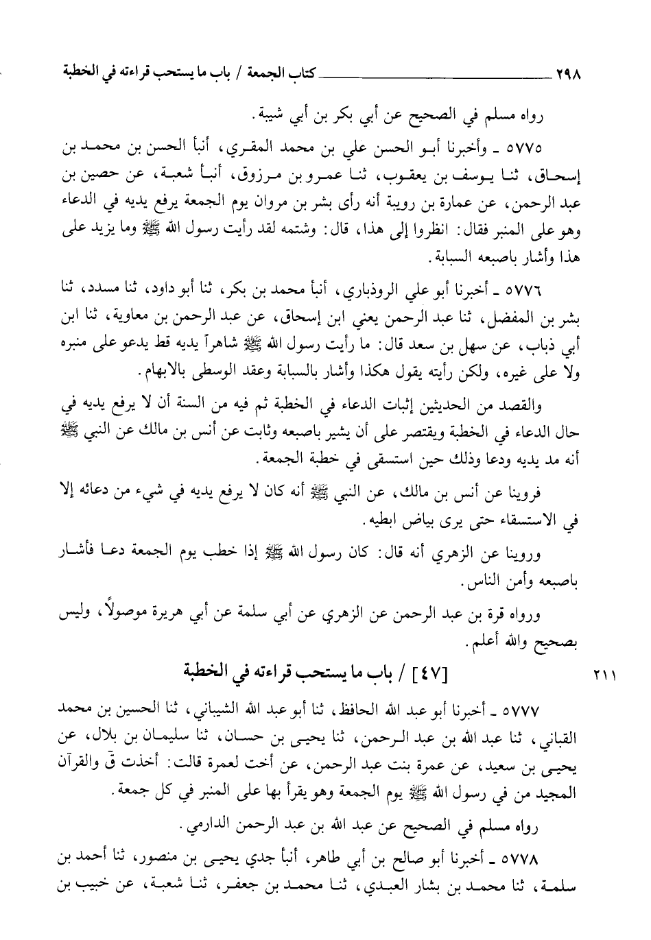 5776 - أَخْبَرَنَا أَبُو عَلِيٍّ الرُّوذْبَارِيُّ، أنبأ مُحَمَّدُ بْنُ بَكْرٍ، ثنا أَبُو دَاوُدَ، ثنا مُسَدَّدٌ، ثنا بِشْرُ بْنُ الْمُفَضَّلِ، ثنا عَبْدُ الرَّحْمَنِ يَعْنِي ابْنَ إِسْحَاقَ، عَنْ عَبْدِ الرَّحْمَنِ بْنِ مُعَاوِيَةَ، ثنا ابْنُ أَبِي ذُبَابٍ، عَنْ سَهْلِ بْنِ سَعْدٍ قَالَ: §" مَا رَأَيْتُ رَسُولَ اللهِ صَلَّى اللهُ عَلَيْهِ وَسَلَّمَ شَاهِرًا يَدَيْهِ قَطُّ يَدْعُو عَلَى مِنْبَرِهِ وَلَا عَلَى غَيْرِهِ، وَلَكِنْ رَأَيْتُهُ يَقُولُ هَكَذَا، وَأَشَارَ بِالسَّبَابَةِ وَعَقَدَ الْوُسْطَى بِالْإِبْهَامِ ". وَالْقَصْدُ مِنَ الْحَدِيثَيْنِ إِثْبَاتُ الدُّعَاءِ فِي الْخُطْبَةِ، ثُمَّ فِيهِ مِنَ السُّنَّةِ أَنْ لَا يَرْفَعَ يَدَيْهِ فِي حَالِ الدُّعَاءِ فِي الْخُطْبَةِ وَيَقْتَصِرَ عَلَى أَنْ يُشِيرَ بِأُصْبُعِهِ. وَثَابِتٌ عَنْ أَنَسِ بْنِ مَالِكٍ عَنِ النَّبِيِّ صَلَّى اللهُ عَلَيْهِ وَسَلَّمَ: " أَنَّهُ مَدَّ يَدَيْهِ وَدَعَا وَذَلِكَ حِينَ اسْتَسْقَى فِي خُطْبَةِ الْجُمُعَةِ "