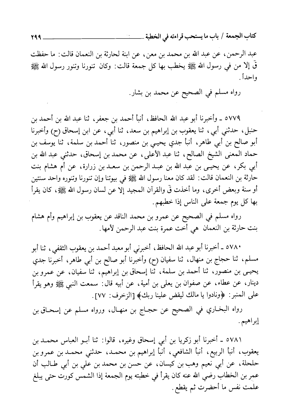 5779 - وَأَخْبَرَنَا أَبُو عَبْدِ اللهِ الْحَافِظُ، أنبأ أَحْمَدُ بْنُ جَعْفَرٍ، ثنا عَبْدُ اللهِ بْنُ أَحْمَدَ بْنِ حَنْبَلٍ، حَدَّثَنِي أَبِي، ثنا يَعْقُوبُ بْنُ إِبْرَاهِيمَ بْنِ سَعْدٍ، ثنا أَبِي، عَنِ ابْنِ إِسْحَاقَ، ح وَأَخْبَرَنَا أَبُو صَالِحِ بْنُ أَبِي طَاهِرٍ، أنبأ جَدِّي يَحْيَى بْنُ مَنْصُورٍ، ثنا أَحْمَدُ بْنُ سَلَمَةَ، ثنا يُوسُفُ بْنُ حَمَّادٍ الْمَعْنِيُّ الشَّيْخُ الصَّالِحُ، ثنا عَبْدُ الْأَعْلَى، عَنْ مُحَمَّدِ بْنِ إِسْحَاقَ، حَدَّثَنِي عَبْدُ اللهِ بْنُ أَبِي بَكْرٍ، عَنْ يَحْيَى بْنِ عَبْدِ اللهِ بْنِ عَبْدِ الرَّحْمَنِ بْنِ سَعْدِ بْنِ زُرَارَةَ، عَنْ أُمِّ هِشَامٍ بِنْتِ حَارِثَةَ بْنِ النُّعْمَانِ قَالَتْ: " لَقَدْ كَانَ مَعَنَا رَسُولُ اللهِ صَلَّى اللهُ عَلَيْهِ وَسَلَّمَ فِي بُيُوتِنَا وَإِنَّ تَنُّورَنَا وَتَنُّورَهُ وَاحِدٌ سَنَتَيْنِ أَوْ سَنَةً وَبَعْضَ أُخْرَى، §وَمَا أَخَذْتُ ق، وَالْقُرْآنِ الْمَجِيدِ إِلَّا عَنْ لِسَانِ رَسُولِ اللهِ صَلَّى اللهُ عَلَيْهِ وَسَلَّمَ، كَانَ يَقْرَأُ بِهَا كُلَّ يَوْمِ جُمُعَةٍ عَلَى النَّاسِ إِذَا خَطَبَهُمْ ". رَوَاهُ مُسْلِمٌ فِي الصَّحِيحِ، عَنْ عَمْرِو بْنِ مُحَمَّدٍ النَّاقِدِ، عَنْ يَعْقُوبَ بْنِ إِبْرَاهِيمَ. وَأُمُّ هِشَامٍ بِنْتُ حَارِثَةَ بْنِ النُّعْمَانِ هِيَ أُخْتُ عَمْرَةَ بِنْتِ عَبْدِ الرَّحْمَنِ لِأُمِّهَا