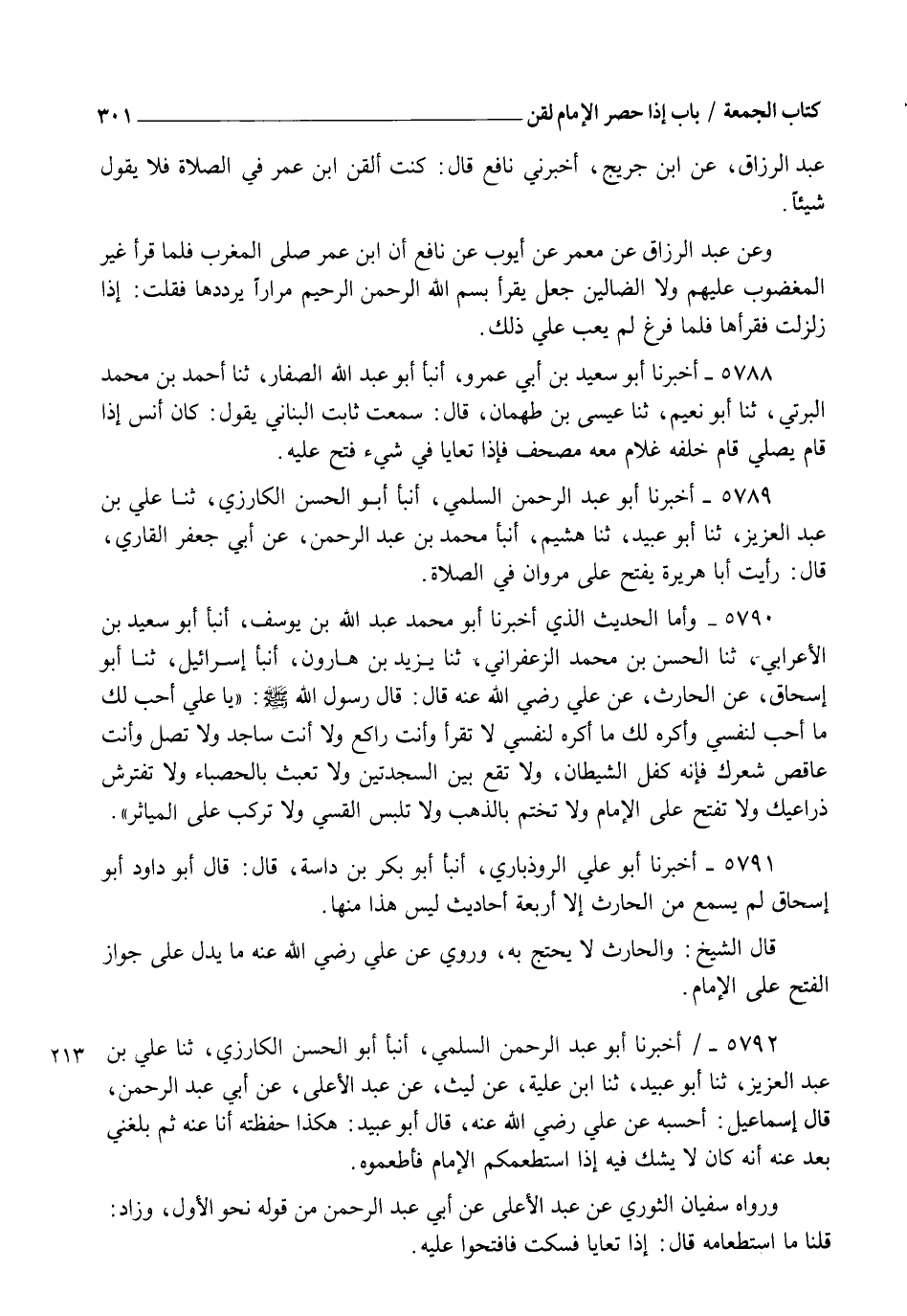 5791 - أَخْبَرَنَا أَبُو عَلِيٍّ الرُّوذْبَارِيُّ، أَنْبَأَ أَبُو بَكْرِ بْنُ دَاسَةَ قَالَ: قَالَ أَبُو دَاوُدَ: أَبُو إِسْحَاقَ لَمْ يَسْمَعْ مِنَ الْحَارِثِ إِلَّا أَرْبَعَةَ أَحَادِيثَ، لَيْسَ هَذَا مِنْهَا. قَالَ الشَّيْخُ: وَالْحَارِثُ لَا يُحْتَجُّ بِهِ، وَرُوِيَ عَنْ عَلِيٍّ رَضِيَ اللهُ عَنْهُ مَا يَدُلُّ عَلَى جَوَازِ الْفَتْحِ عَلَى الْإِمَامِ
