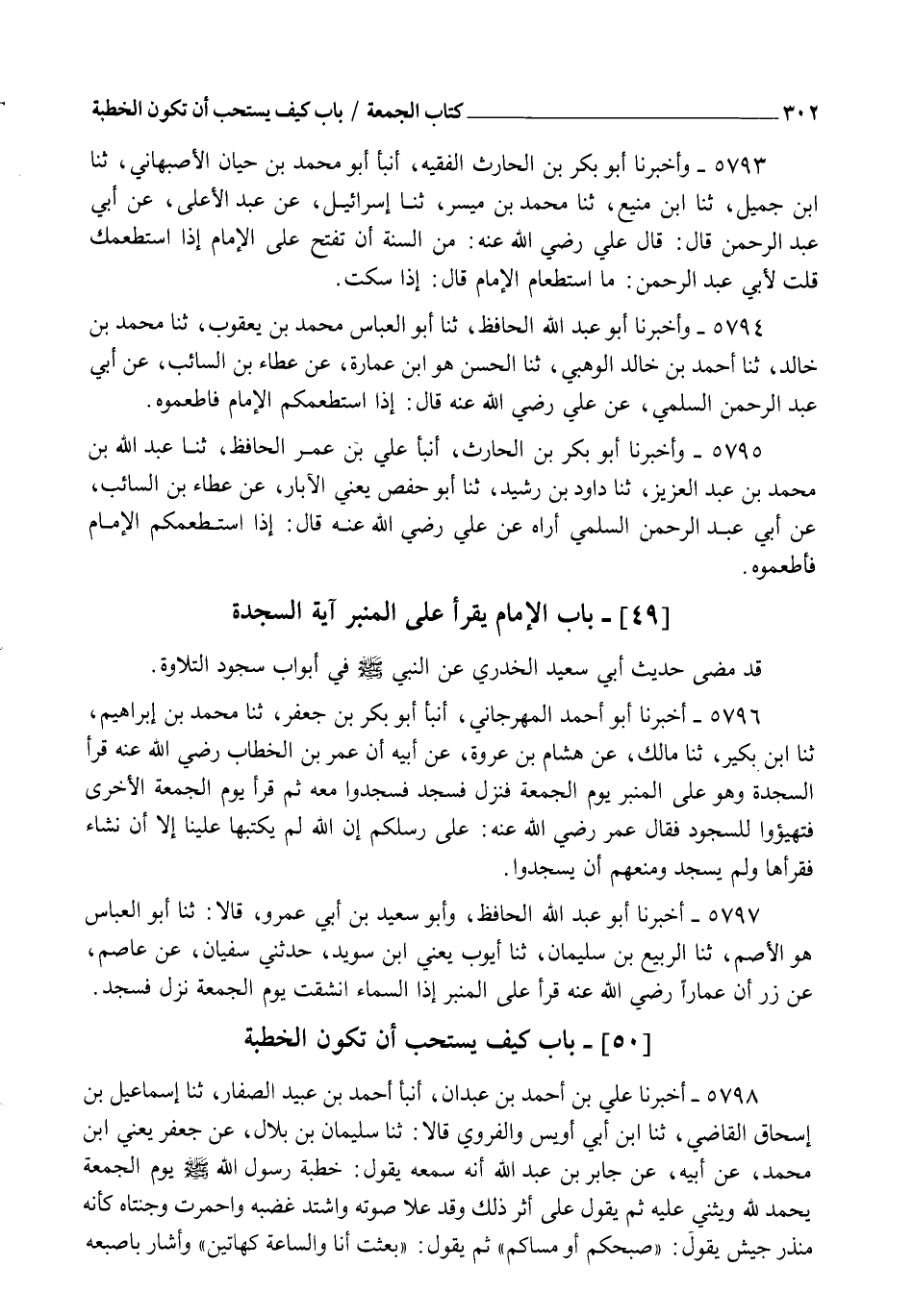 5796 - أَخْبَرَنَا أَبُو أَحْمَدَ الْمِهْرَجَانِيُّ، أنبأ أَبُو بَكْرِ بْنُ جَعْفَرٍ، ثنا مُحَمَّدُ بْنُ إِبْرَاهِيمَ، ثنا ابْنُ بُكَيْرٍ، ثنا مَالِكٌ، عَنْ هِشَامِ بْنِ عُرْوَةَ، عَنْ أَبِيهِ،: " أَنَّ عُمَرَ بْنَ الْخَطَّابِ، رَضِيَ اللهُ عَنْهُ قَرَأَ السَّجْدَةَ وَهُوَ عَلَى الْمِنْبَرِ يَوْمَ الْجُمُعَةِ، فَنَزَلَ فَسَجَدَ فَسَجَدُوا مَعَهُ، ثُمَّ قَرَأَ يَوْمَ الْجُمُعَةِ الْأُخْرَى، فَتَهَيَّئُوا لِلسُّجُودِ، فَقَالَ عُمَرُ رَضِيَ اللهُ عَنْهُ: §" عَلَى رِسْلِكُمْ، إِنَّ اللهَ لَمْ يَكْتُبْهَا عَلَيْنَا إِلَّا أَنْ نَشَاءَ ". فَقَرَأَهَا وَلَمْ يَسْجُدْ وَمَنَعَهُمْ أَنْ يَسْجُدُوا "