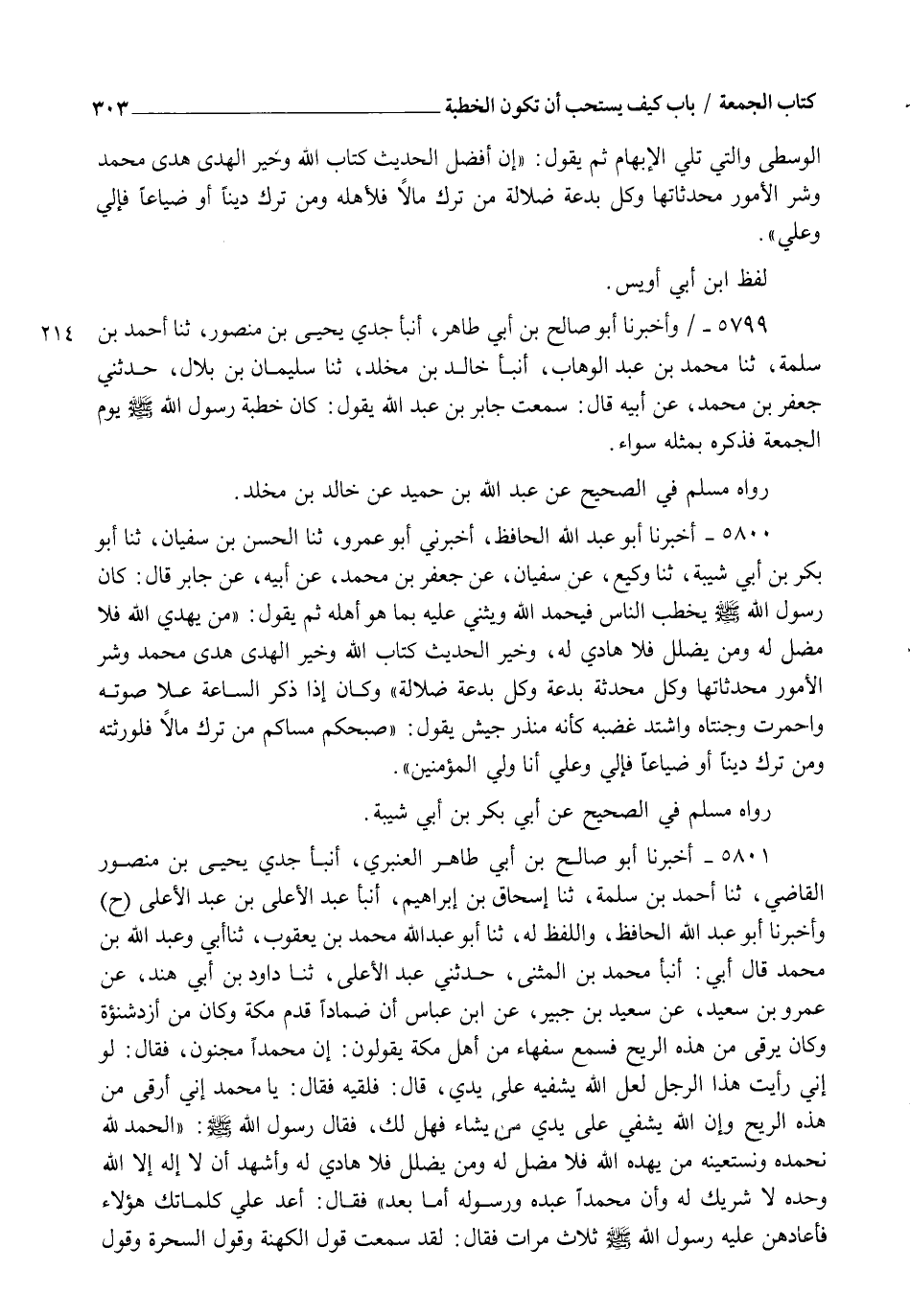 5800 - أَخْبَرَنَا أَبُو عَبْدِ اللهِ الْحَافِظُ، أَخْبَرَنِي أَبُو عَمْرٍو، ثنا الْحَسَنُ بْنُ سُفْيَانَ، ثنا أَبُو بَكْرِ بْنُ أَبِي شَيْبَةَ، ثنا وَكِيعٌ، عَنْ سُفْيَانَ، عَنْ جَعْفَرِ بْنِ مُحَمَّدٍ، عَنْ أَبِيهِ، عَنْ جَابِرٍ قَالَ: " كَانَ رَسُولُ اللهِ صَلَّى اللهُ عَلَيْهِ وَسَلَّمَ يَخْطُبُ النَّاسَ فَيَحْمَدُ اللهَ وَيُثْنِي عَلَيْهِ بِمَا هُوَ أَهْلُهُ، ثُمَّ يَقُولُ: " §مَنْ يَهْدِ اللهُ فَلَا مُضِلَّ لَهُ، وَمَنْ يُضْلِلْ فَلَا هَادِيَ لَهُ، وَخَيْرُ الْحَدِيثِ كِتَابُ اللهِ، وَخَيْرُ الْهَدْيِ هَدْيُ مُحَمَّدٍ، وَشَرُّ الْأُمُورِ مُحْدَثَاتُهَا، وَكُلُّ مُحْدَثَةٍ بِدْعَةٌ، وَكُلُّ بِدْعَةٍ ضَلَالَةٌ ". وَكَانَ إِذَا ذَكَرَ السَّاعَةَ عَلَا صَوْتُهُ، وَاحْمَرَّتْ وَجْنَتَاهُ، وَاشْتَدَّ غَضَبُهُ كَأَنَّهُ مُنْذِرُ جَيْشٍ يَقُولُ: " صَبَّحَكُمْ مَسَّاكُمْ، مَنْ تَرَكَ مَالًا فَلِوَرَثَتِهِ، وَمَنْ تَرَكَ دَيْنًا أَوْ ضَيَاعًا فَإِلَيَّ وَعَلَيَّ، أَنَا وَلِيُّ الْمُؤْمِنِينَ " رَوَاهُ مُسْلِمٌ فِي الصَّحِيحِ عَنْ أَبِي بَكْرِ بْنِ أَبِي شَيْبَةَ