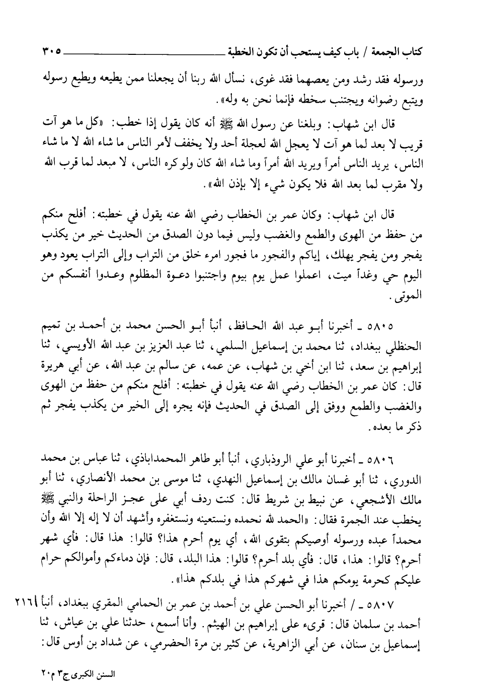 5805 - أَخْبَرَنَا أَبُو عَبْدِ اللهِ الْحَافِظُ، أنبأ أَبُو الْحَسَنِ مُحَمَّدُ بْنُ أَحْمَدَ بْنِ تَمِيمٍ الْحَنْظَلِيُّ بِبَغْدَادَ، ثنا مُحَمَّدُ بْنُ إِسْمَاعِيلَ السُّلَمِيُّ، ثنا عَبْدُ الْعَزِيزِ بْنُ عَبْدِ اللهِ الْأُوَيْسِيُّ، ثنا إِبْرَاهِيمُ بْنُ سَعْدٍ، ثنا ابْنُ أَخِي ابْنِ شِهَابٍ، عَنْ عَمِّهِ، عَنْ سَالِمِ بْنِ عَبْدِ اللهِ، عَنْ أَبِي هُرَيْرَةَ قَالَ: كَانَ عُمَرُ بْنُ الْخَطَّابِ رَضِيَ اللهُ عَنْهُ يَقُولُ فِي خُطْبَتِهِ: §" أَفْلَحَ مِنْكُمْ مَنْ حُفِظَ مِنَ الْهَوَى وَالْغَضَبِ وَالطَّمِعِ وَوُفِّقَ إِلَى الصِّدْقِ فِي الْحَدِيثِ، فَإِنَّهُ يَجُرُّهُ إِلَى الْخَيْرِ، مَنْ يَكْذِبْ يَفْجُرْ ". ثُمَّ ذَكَرَ مَا بَعْدَهُ