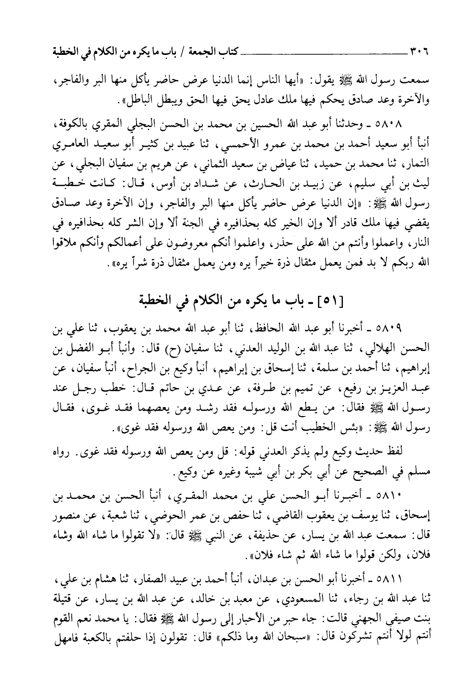5809 - أَخْبَرَنَا أَبُو عَبْدِ اللهِ الْحَافِظُ، ثنا أَبُو عَبْدِ اللهِ مُحَمَّدُ بْنُ يَعْقُوبَ ثنا عَلِيُّ بْنُ الْحَسَنِ الْهِلَالِيُّ، ثنا عَبْدُ اللهِ بْنُ الْوَلِيدِ الْعَدَنِيُّ، ثنا سُفْيَانُ، ح قَالَ: وَأنبأ أَبُو الْفَضْلِ بْنُ إِبْرَاهِيمَ، ثنا أَحْمَدُ بْنُ سَلَمَةَ، ثنا إِسْحَاقُ بْنُ إِبْرَاهِيمَ، أنبأ وَكِيعُ بْنُ الْجَرَّاحِ، أنبأ سُفْيَانُ، عَنْ عَبْدِ الْعَزِيزِ بْنِ رُفَيْعٍ، عَنْ تَمِيمِ بْنِ طَرَفَةَ، عَنْ عَدِيِّ بْنِ حَاتِمٍ قَالَ: خَطَبَ رَجُلٌ عَنْدَ رَسُولِ اللهِ صَلَّى اللهُ عَلَيْهِ وَسَلَّمَ فَقَالَ: مَنْ يُطِعِ اللهَ وَرَسُولَهُ فَقَدْ رَشَدَ وَمَنْ يَعْصِهِمَا فَقَدْ غَوَى، فَقَالَ رَسُولُ اللهِ صَلَّى اللهُ عَلَيْهِ وَسَلَّمَ: " بِئْسَ الْخَطِيبُ أَنْتَ، قُلْ: §" وَمَنْ يَعْصِ اللهَ وَرَسُولَهُ فَقَدْ غَوَى ". لَفْظُ حَدِيثِ وَكِيعٍ وَلَمْ يَذْكُرْ الْعَدَنِيُّ قَوْلَهُ: " قُلْ: وَمَنْ يَعْصِ اللهَ وَرَسُولَهُ فَقَدْ غَوَى ". رَوَاهُ مُسْلِمٌ فِي الصَّحِيحِ عَنْ أَبِي بَكْرِ بْنِ أَبِي شَيْبَةَ وَغَيْرِهِ عَنْ وَكِيعٍ