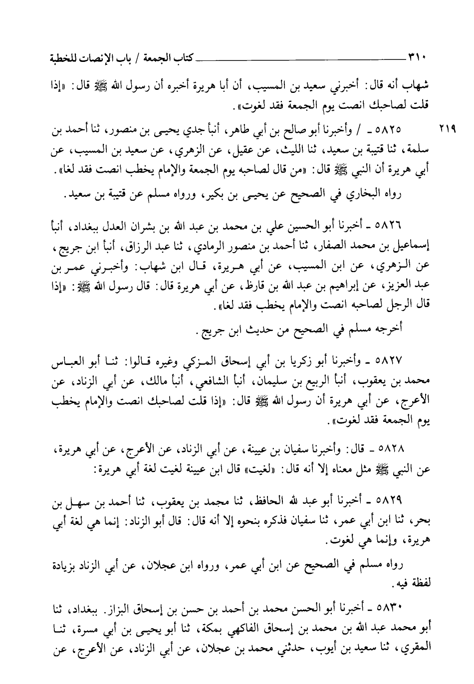 5825 - وَأَخْبَرَنَا أَبُو صَالِحِ بْنُ أَبِي طَاهِرٍ، أنبأ جَدِّي يَحْيَى بْنُ مَنْصُورٍ ثنا أَحْمَدُ بْنُ سَلَمَةَ، ثنا قُتَيْبَةُ بْنُ سَعِيدٍ، ثنا اللَّيْثُ، عَنْ عُقَيْلٍ، عَنِ الزُّهْرِيِّ، عَنْ سَعِيدِ بْنِ الْمُسَيِّبِ، عَنْ أَبِي هُرَيْرَةَ، أَنَّ النَّبِيَّ صَلَّى اللهُ عَلَيْهِ وَسَلَّمَ قَالَ: " §مَنْ قَالَ لِصَاحِبِهِ يَوْمَ الْجُمُعَةِ وَالْإِمَامُ يَخْطُبُ: أَنْصِتْ، فَقَدْ لَغَا " رَوَاهُ الْبُخَارِيُّ فِي الصَّحِيحِ عَنْ يَحْيَى بْنِ بُكَيْرٍ، وَرَوَاهُ مُسْلِمٌ عَنْ قُتَيْبَةَ بْنِ سَعِيدٍ