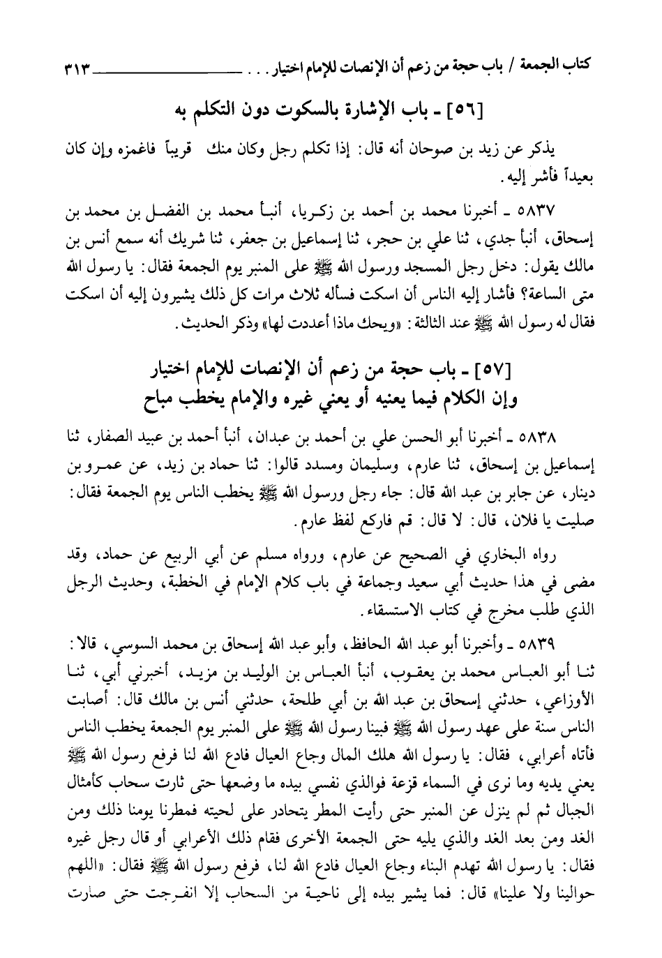 5838 - أَخْبَرَنَا أَبُو الْحَسَنِ عَلِيُّ بْنُ أَحْمَدَ بْنِ عَبْدَانَ، أنبأ أَحْمَدُ بْنُ عُبَيْدٍ الصَّفَّارُ، ثنا إِسْمَاعِيلُ بْنُ إِسْحَاقَ، ثنا عَارِمٌ، وَسُلَيْمَانُ، وَمُسَدَّدٌ، قَالُوا: ثنا حَمَّادُ بْنُ زَيْدٍ، عَنْ عَمْرِو بْنِ دِينَارٍ، عَنْ جَابِرِ بْنِ عَبْدِ اللهِ قَالَ: جَاءَ رَجُلٌ وَرَسُولُ اللهِ صَلَّى اللهُ عَلَيْهِ وَسَلَّمَ يَخْطُبُ النَّاسَ يَوْمَ الْجُمُعَةِ فَقَالَ: " صَلَّيْتَ يَا فُلَانُ؟ " قَالَ: لَا قَالَ: §" قُمْ فَارْكَعْ ". لَفْظُ عَارِمٍ. رَوَاهُ الْبُخَارِيُّ فِي الصَّحِيحِ عَنْ عَارِمٍ، وَرَوَاهُ مُسْلِمٌ عَنْ أَبِي رَبِيعٍ عَنْ حَمَّادٍ وَقَدْ مَضَى فِي هَذَا حَدِيثُ أَبِي سَعِيدٍ وَجَمَاعَةٍ فِي بَابِ كَلَامِ الْإِمَامِ فِي الْخُطْبَةِ، وَحَدِيثُ الرَّجُلِ الَّذِي طَلَبَ مَخْرَجًا فِي كِتَابِ الِاسْتِسْقَاءِ