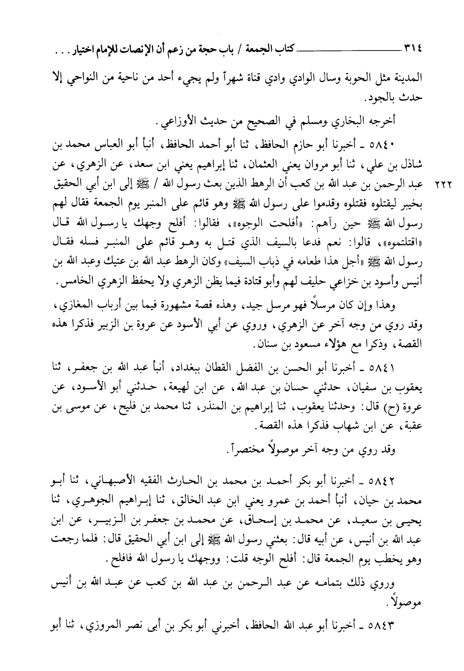5840 - أَخْبَرَنَا أَبُو حَازِمٍ الْحَافِظُ، ثنا أَبُو أَحْمَدَ الْحَافِظُ، أنبأ أَبُو الْعَبَّاسِ مُحَمَّدُ بْنُ شَاذِلِ بْنِ عَلِيٍّ ثنا أَبُو مَرْوَانَ يَعْنِي الْعُثْمَانِيَّ، ثنا إِبْرَاهِيمُ يَعْنِي ابْنَ سَعْدٍ، عَنِ الزُّهْرِيِّ، عَنْ عَبْدِ الرَّحْمَنِ بْنِ عَبْدِ اللهِ بْنِ كَعْبٍ أَنَّ الرَّهْطَ الَّذِينَ بَعَثَ رَسُولُ اللهِ صَلَّى اللهُ عَلَيْهِ وَسَلَّمَ إِلَى ابْنِ أَبِي الْحُقَيْقِ بِخَيْبَرَ لِيَقْتُلُوهُ فَقَتَلُوهُ وَقَدِمُوا عَلَى رَسُولِ اللهِ صَلَّى اللهُ عَلَيْهِ وَسَلَّمَ وَهُوَ قَائِمٌ عَلَى الْمِنْبَرِ يَوْمَ الْجُمُعَةِ فَقَالَ لَهُمْ رَسُولُ اللهِ صَلَّى اللهُ عَلَيْهِ وَسَلَّمَ حِينَ رَآهُمْ: " §أَفْلَحْتِ الْوُجُوهُ " فَقَالُوا: أَفْلَحَ وَجْهُكَ يَا رَسُولَ اللهِ قَالَ: " أَقَتَلْتُمُوهُ؟ " قَالُوا: نَعَمْ فَدَعَا بِالسَّيْفِ الَّذِي قُتِلَ بِهِ، وَهُوَ قَائِمٌ عَلَى الْمِنْبَرِ فَسَلَّهُ فَقَالَ رَسُولُ اللهِ صَلَّى اللهُ عَلَيْهِ وَسَلَّمَ: " أَجَلْ، هَذَا طَعَامُهُ فِي ذُبَابِ السَّيْفِ " وَكَانَ الرَّهْطُ: عَبْدُ اللهِ بْنُ عَتِيكٍ، وَعَبْدُ اللهِ بْنُ أُنَيْسٍ، وَأَسْوَدُ بْنُ خُزَاعِيٍّ حَلِيفٌ لَهُمْ، وَأَبُو قَتَادَةَ فِيمَا يَظُنُّ الزُّهْرِيُّ، وَلَا يَحْفَظُ الزُّهْرِيُّ الْخَامِسَ. وَهَذَا وَإِنْ كَانَ مُرْسَلًا فَهُوَ مُرْسَلٌ جَيِّدٌ، وَهَذِهِ قِصَّةٌ مَشْهُورَةٌ فِيمَا بَيْنَ أَرْبَابِ الْمَغَازِي، وَقَدْ رُوِيَ مِنْ وَجْهٍ آخَرَ عَنِ الزُّهْرِيِّ، وَرُوِيَ عَنْ أَبِي الْأَسْوَدِ عَنْ عُرْوَةَ بْنِ الزُّبَيْرِ فَذَكَرَا هَذِهِ الْقِصَّةِ وَذَكَرَا مَعَ هَؤُلَاءِ مَسْعُودَ بْنَ سِنَانٍ.