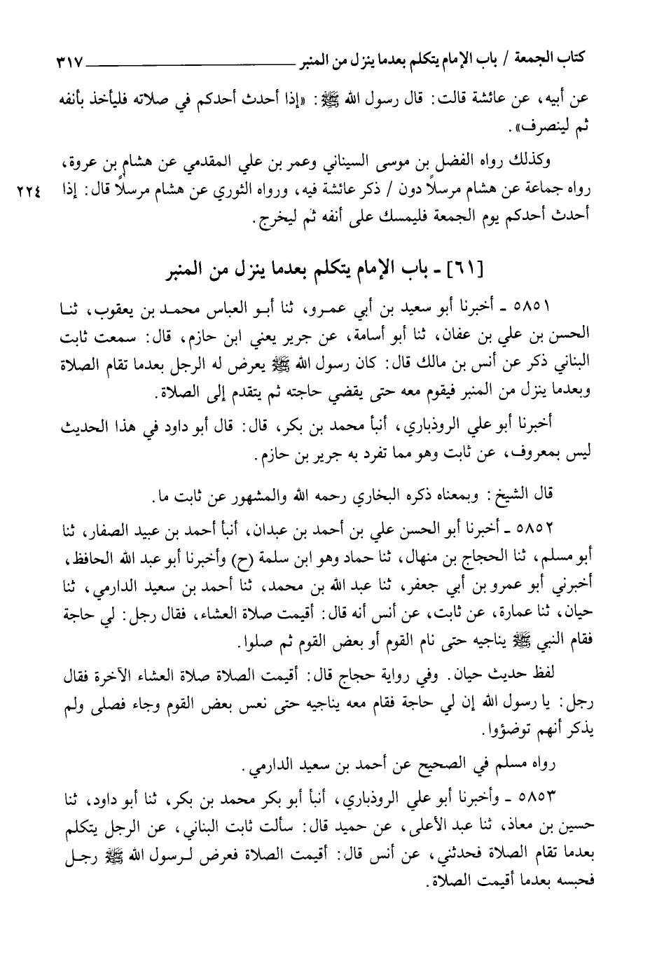 5851 - أَخْبَرَنَا أَبُو سَعِيدِ بْنُ أَبِي عَمْرٍو، ثنا أَبُو الْعَبَّاسِ مُحَمَّدُ بْنُ يَعْقُوبَ، ثنا الْحَسَنُ بْنُ عَلِيِّ بْنِ عَفَّانَ , ثنا أَبُو أُسَامَةَ، عَنْ جَرِيرٍ يَعْنِي ابْنَ حَازِمٍ قَالَ: سَمِعْتُ ثَابِتًا الْبُنَانِيَّ ذَكَرَ عَنْ أَنَسِ بْنِ مَالِكٍ قَالَ: " كَانَ رَسُولُ اللهِ صَلَّى اللهُ عَلَيْهِ وَسَلَّمَ §يَعْرِضُ لَهُ الرَّجُلُ بَعْدَمَا تُقَامُ الصَّلَاةُ , وَبَعْدَمَا يَنْزِلُ مِنَ الْمِنْبَرِ , فَيَقُومُ مَعَهُ حَتَّى يَقْضِيَ حَاجَتَهُ , ثُمَّ يَتَقَدَّمُ إِلَى الصَّلَاةِ " أَخْبَرَنَا أَبُو عَلِيٍّ الرُّوذْبَارِيُّ، أَنْبَأَ مُحَمَّدُ بْنُ بَكْرٍ قَالَ: قَالَ أَبُو دَاوُدَ فِي هَذَا الْحَدِيثِ: لَيْسَ بِمَعْرُوفٍ عَنْ ثَابِتٍ، وَهُوَ مِمَّا تَفَرَّدَ بِهِ جَرِيرُ بْنُ حَازِمٍ قَالَ الشَّيْخُ: وَبِمَعْنَاهُ ذَكَرَهُ الْبُخَارِيُّ رَحِمَهُ اللهُ، وَالْمَشْهُورُ عَنْ ثَابِتٍ مَا