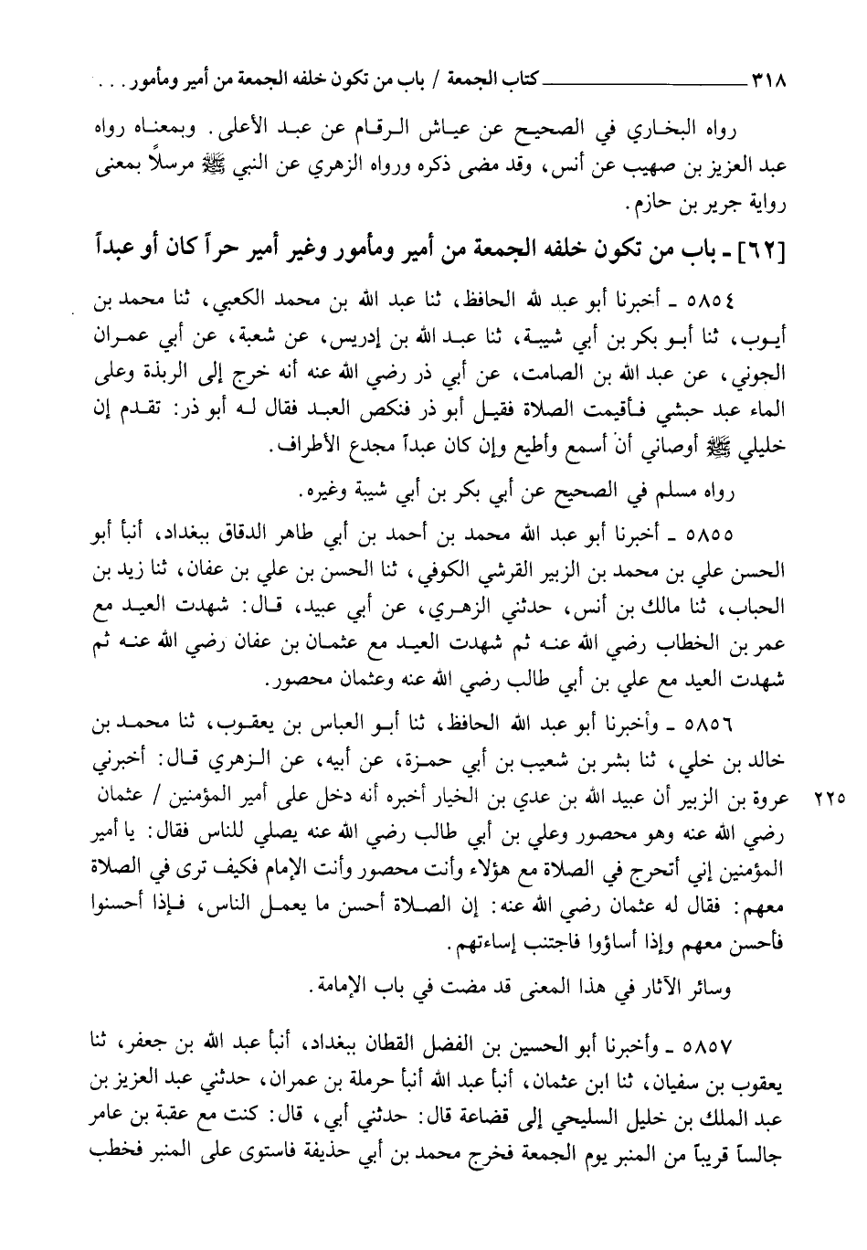 5854 - أَخْبَرَنَا أَبُو عَبْدِ اللهِ الْحَافِظُ، ثنا عَبْدُ اللهِ بْنُ مُحَمَّدٍ الْكَعْبِيُّ، ثنا مُحَمَّدُ بْنُ أَيُّوبَ، ثنا أَبُو بَكْرِ بْنُ أَبِي شَيْبَةَ، ثنا عَبْدُ اللهِ بْنُ إِدْرِيسَ، عَنْ شُعْبَةَ، عَنْ أَبِي عِمْرَانَ الْجَوْنِيِّ، عَنْ عَبْدِ اللهِ بْنِ الصَّامِتِ، عَنْ أَبِي ذَرٍّ رَضِيَ اللهُ عَنْهُ أَنَّهُ خَرَجَ إِلَي الرَّبَذَةِ , وَعَلَى الْمَاءِ عَبْدٌ حَبَشِيٌّ , فَأُقِيمَتِ الصَّلَاةُ ,، فَقِيلَ أَبُو ذَرٍّ , فَنَكَصَ الْعَبْدُ فَقَالَ لَهُ أَبُو ذَرٍّ: " تَقَدَّمْ؛ إِنَّ خَلِيلِي صَلَّى اللهُ عَلَيْهِ وَسَلَّمَ §أَوْصَانِي أَنْ أَسْمَعَ وَأُطِيعَ وَإِنْ كَانَ عَبْدًا مُجَدَّعَ الْأَطْرَافِ " رَوَاهُ مُسْلِمٌ فِي الصَّحِيحِ عَنْ أَبِي بَكْرِ بْنِ أَبِي شَيْبَةَ وَغَيْرِهِ