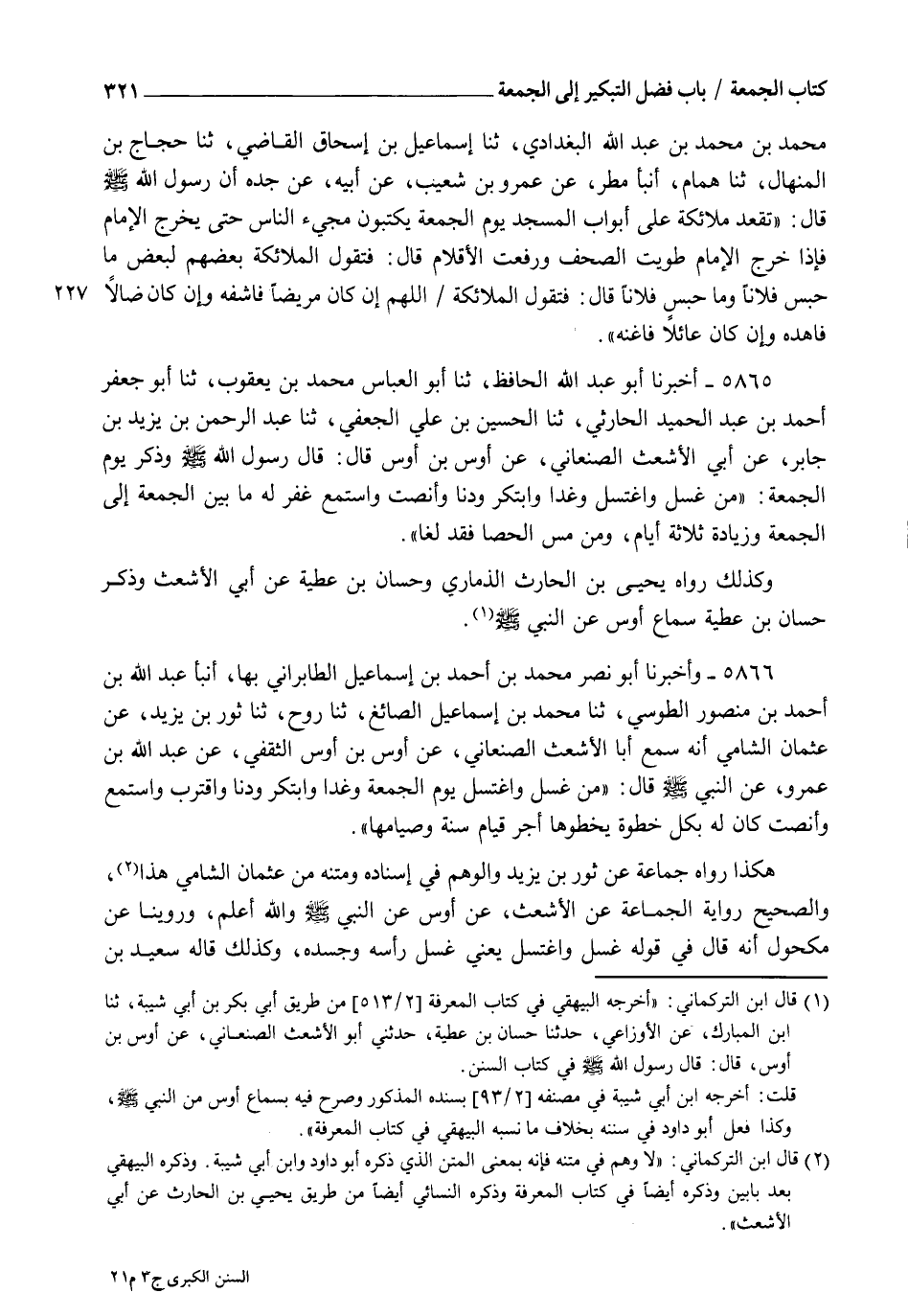 5866 - وَأَخْبَرَنَا أَبُو نَصْرٍ مُحَمَّدُ بْنُ أَحْمَدَ بْنِ إِسْمَاعِيلَ الطَّبَرَانِيُّ بِهَا , أنبأ عَبْدُ اللهِ بْنُ أَحْمَدَ بْنِ مَنْصُورٍ الطُّوسِيُّ، ثنا مُحَمَّدُ بْنُ إِسْمَاعِيلَ الصَّائِغُ، ثنا رَوْحٌ، ثنا ثَوْرُ بْنُ يَزِيدَ، عَنْ عُثْمَانَ الشَّامِيِّ أَنَّهُ سَمِعَ أَبَا الْأَشْعَثِ الصَّنْعَانِيَّ، عَنْ أَوْسِ بْنِ أَوْسٍ الثَّقَفِيِّ، عَنْ عَبْدِ اللهِ بْنِ عَمْرٍو، عَنِ النَّبِيِّ صَلَّى اللهُ عَلَيْهِ وَسَلَّمَ قَالَ: §" مَنْ غَسَّلَ وَاغْتَسَلَ يَوْمَ الْجُمُعَةِ , وَغَدَا وَابْتَكَرَ، وَدَنَا وَاقْتَرَبَ، وَاسْتَمَعَ وَأَنْصَتَ، كَانَ لَهُ بِكُلِّ خُطْوَةٍ يَخْطُوهَا أَجْرُ قِيَامِ سَنَةٍ وَصِيَامِهَا ". هَكَذَا رَوَاهُ جَمَاعةٌ عَنْ ثَوْرِ بْنِ يَزِيدَ، وَالْوَهْمُ فِي إِسْنَادِهِ وَمَتْنِهِ مِنْ عُثْمَانَ الشَّامِيِّ هَذَا، وَالصَّحِيحُ رِوَايَةُ الْجَمَاعَةِ عَنِ الْأَشْعَثِ عَنْ أَوْسٍ عَنِ النَّبِيِّ صَلَّى اللهُ عَلَيْهِ وَسَلَّمَ وَاللهُ أَعْلَمُ، وَرُوِّينَا عَنْ مَكْحُولٍ أَنَّهُ قَالَ فِي قَوْلِهِ " غَسَّلَ وَاغْتَسَلَ " يَعْنِي غَسَّلَ رَأْسَهُ وَجَسَدَهُ، وَكَذَلِكَ قَالَهُ سَعِيدُ بْنُ -[322]- عَبْدِ الْعَزِيزِ وَهَذَا هُوَ الصَّحِيحُ لِأَنَّهُمْ كَانُوا يَجْعَلُونَ فِي رُءُوسِهِمْ الْخِطْمِيَّ أَوْغَيْرِهِ، فَكَانُوا أَوَّلًا يَغْسِلُونَ رُءُوسَهَمْ ثُمَّ يَغْتَسِلُونَ، وَاللهُ أَعْلَمُ