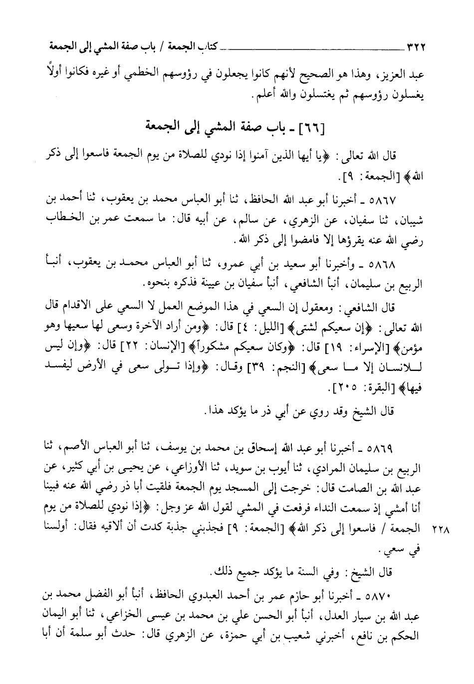 5869 - أَخْبَرَنَا أَبُو عَبْدِ اللهِ إِسْحَاقُ بْنُ مُحَمَّدِ بْنِ يُوسُفَ , ثنا أَبُو الْعَبَّاسِ الْأَصَمُّ، ثنا الرَّبِيعُ بْنُ سُلَيْمَانَ الْمُرَادِيُّ، ثنا أَيُّوبُ بْنُ سُوَيْدٍ، ثنا الْأَوْزَاعِيُّ، عَنْ يَحْيَى بْنِ أَبِي كَثِيرٍ، عَنْ عَبْدِ اللهِ بْنِ الصَّامِتِ قَالَ: " خَرَجْتُ إِلَى الْمَسْجِدِ يَوْمَ الْجُمُعَةِ , فَلَقِيتُ أَبَا ذَرٍّ رَضِيَ اللهُ عَنْهُ، فَبَيْنَمَا أَنَا أَمْشِي إِذْ سَمِعْتُ النِّدَاءَ , فَرَفَعْتُ فِي الْمَشْيِ؛ لِقَوْلِ اللهِ عَزَّ وَجَلَّ {إِذَا نُودِيَ لِلصَّلَاةِ مَنْ يَوْمِ الْجُمُعَةِ فَاسْعَوْا إِلَى ذِكْرِ اللهِ} [الجمعة: 9]، فَجَذَبَنِي جَذْبَةً كِدْتُ أَنْ أُلَاقِيَهِ , فَقَالَ: " §أَوَلَسْنَا فِي سَعْيٍ؟ ". قَالَ الشَّيْخُ: وَفِي السُّنَّةِ مَا يُؤَكِّدُ جَمِيعَ ذَلِكَ