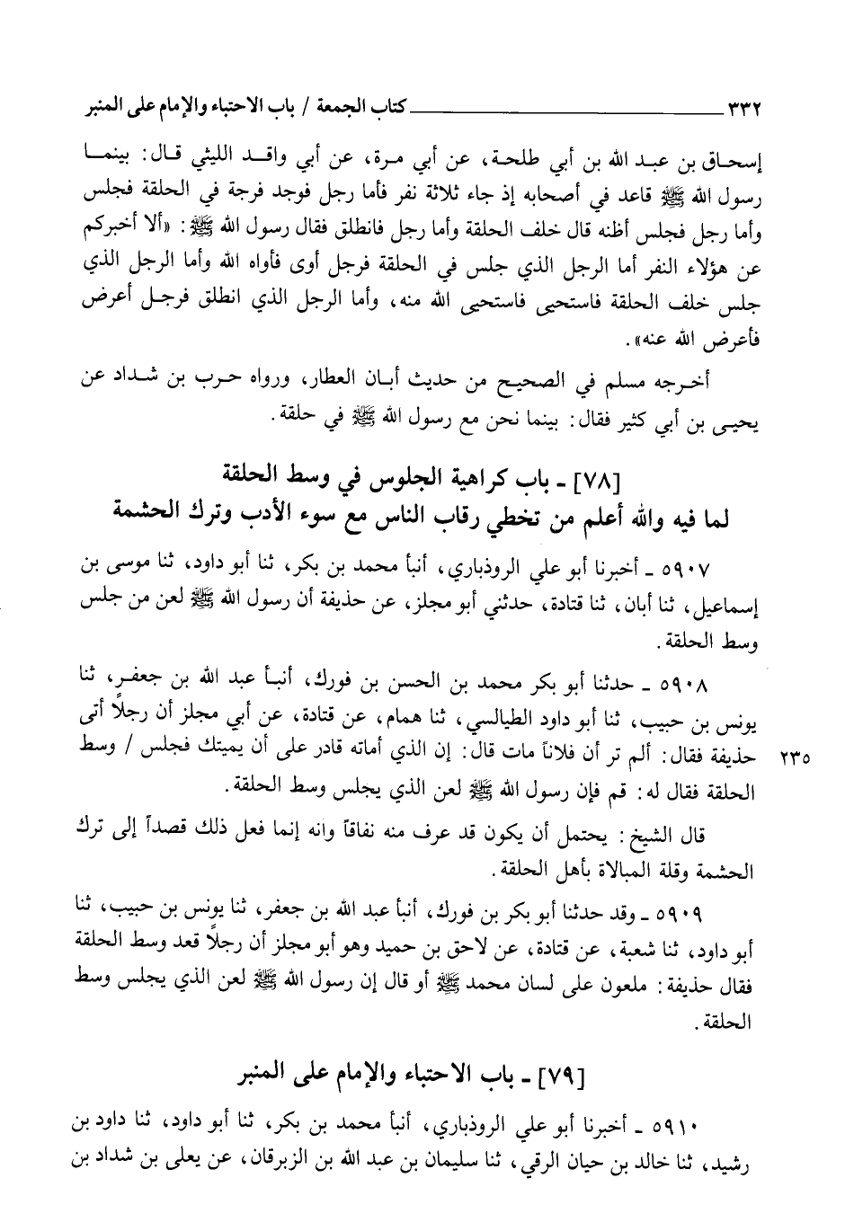5909 - وَقَدْ حَدَّثَنَا أَبُو بَكْرِ بْنُ فُورَكٍ، أنبأ عَبْدُ اللهِ بْنُ جَعْفَرٍ، ثنا يُونُسُ بْنُ حَبِيبٍ، ثنا أَبُو دَاوُدَ، ثنا شُعْبَةُ، عَنْ قَتَادَةَ، عَنْ لَاحِقِ بْنِ حُمَيْدٍ وَهُوَ أَبُو مِجْلَزٍ , أَنَّ رَجُلًا قَعَدَ وَسَطَ الْحَلْقَةِ، فَقَالَ حُذَيْفَةُ: " مَلْعُونٌ عَلَى لِسَانِ مُحَمَّدٍ صَلَّى اللهُ عَلَيْهِ وَسَلَّمَ، أَوْ قَالَ: إِنَّ رَسُولَ اللهِ صَلَّى اللهُ عَلَيْهِ وَسَلَّمَ §لَعَنَ الَّذِي يَجْلِسُ وَسَطَ الْحَلْقَةِ "