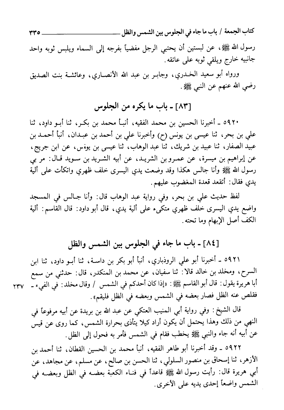 5922 - وَقَدْ أَخْبَرَنَا أَبُو طَاهِرٍ الْفَقِيهُ، أنبأ مُحَمَّدُ بْنُ الْحُسَيْنِ الْقَطَّانُ، ثنا أَحْمَدُ بْنُ الْأَزْهَرِ، ثنا إِسْحَاقُ بْنُ مَنْصُورٍ السَّلُولِيُّ، ثنا الْحَسَنُ بْنُ صَالِحٍ، عَنْ مُسْلِمٍ، عَنْ مُجَاهِدٍ، عَنْ أَبِي هُرَيْرَةَ قَالَ: §" رَأَيْتُ رَسُولَ اللهِ صَلَّى اللهُ عَلَيْهِ وَسَلَّمَ قَاعِدًا فِي فِنَاءِ الْكَعْبَةِ , بَعْضُهُ فِي الظِّلِّ وَبَعْضُهُ فِي الشَّمْسِ، وَاضِعًا إِحْدَى يَدَيْهِ عَلَى الْأُخْرَى "