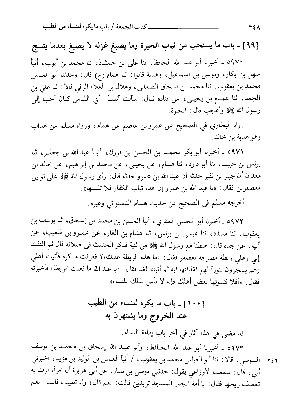 5972 - أَخْبَرَنَا أَبُو الْحَسَنِ الْمُقْرِئُ، أنبأ الْحَسَنُ بْنُ مُحَمَّدِ بْنِ إِسْحَاقَ، ثنا يُوسُفُ بْنُ يَعْقُوبَ، ثنا مُسَدَّدٌ، ثنا عِيسَى بْنُ يُونُسَ، ثنا هِشَامُ بْنُ الْغَازِ، عَنْ عَمْروِ بْنِ شُعَيْبٍ، عَنْ أَبِيهِ، عَنْ جَدِّهِ قَالَ:. هَبَطْنَا مَعَ رَسُولِ اللهِ صَلَّى اللهُ عَلَيْهِ وَسَلَّمَ مِنْ ثَنِيَّةٍ، فَذَكَرَ الْحَدِيثَ فِي صَلَاتِهِ، قَالَ: ثُمَّ الْتَفَتَ إِلَيَّ وَعَلَيَّ رَيْطَةٌ مُضَرَّجَةٌ بِعُصْفُرٍ، فَقَالَ: §" مَا هَذِهِ الرَّيْطَةُ عَلَيْكَ؟ ". فَعَرَفْتُ مَا كَرِهَ، فَأَتَيْتُ أَهْلِي وَهُمْ يَسْجُرُونَ تَنُّورًا لَهُمْ فَقَذَفْتُهَا فِيهِ، ثُمَّ أَتَيْتُهُ الْغَدَ، فَقَالَ: " يَا عَبْدَ اللهِ، مَا فَعَلَتِ الرَّيْطَةُ؟ ". فَأَخْبَرْتُهُ، فَقَالَ: " أَفَلَا كَسَوْتَهَا بَعْضَ أَهْلِكَ؛ فَإِنَّهُ لَا بَأْسَ بِذَلِكَ لِلنِّسَاءِ "