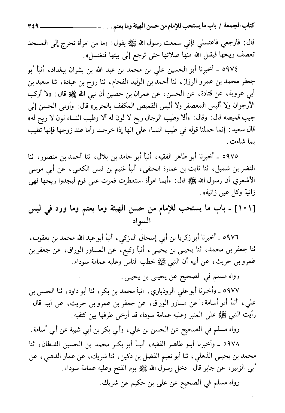 5976 - أَخْبَرَنَا أَبُو زَكَرِيَّا بْنُ أَبِي إِسْحَاقَ الْمُزَكِّي، أنبأ أَبُو عَبْدِ اللهِ مُحَمَّدُ بْنُ يَعْقُوبَ، ثنا جَعْفَرُ بْنُ مُحَمَّدٍ، ثنا يَحْيَى بْنُ يَحْيَى، أنبأ وَكِيعٌ، عَنِ الْمُسَاوِرِ الْوَرَّاقِ، عَنْ جَعْفَرِ بْنِ عَمْرِو بْنِ حُرَيْثٍ، عَنْ أَبِيهِ، " أَنَّ النَّبِيَّ صَلَّى اللهُ عَلَيْهِ وَسَلَّمَ §خَطَبَ النَّاسَ وَعَلَيْهِ عِمَامَةٌ سَوْدَاءُ ". رَوَاهُ مُسْلِمٌ فِي الصَّحِيحِ عَنْ يَحْيَى بْنِ يَحْيَى