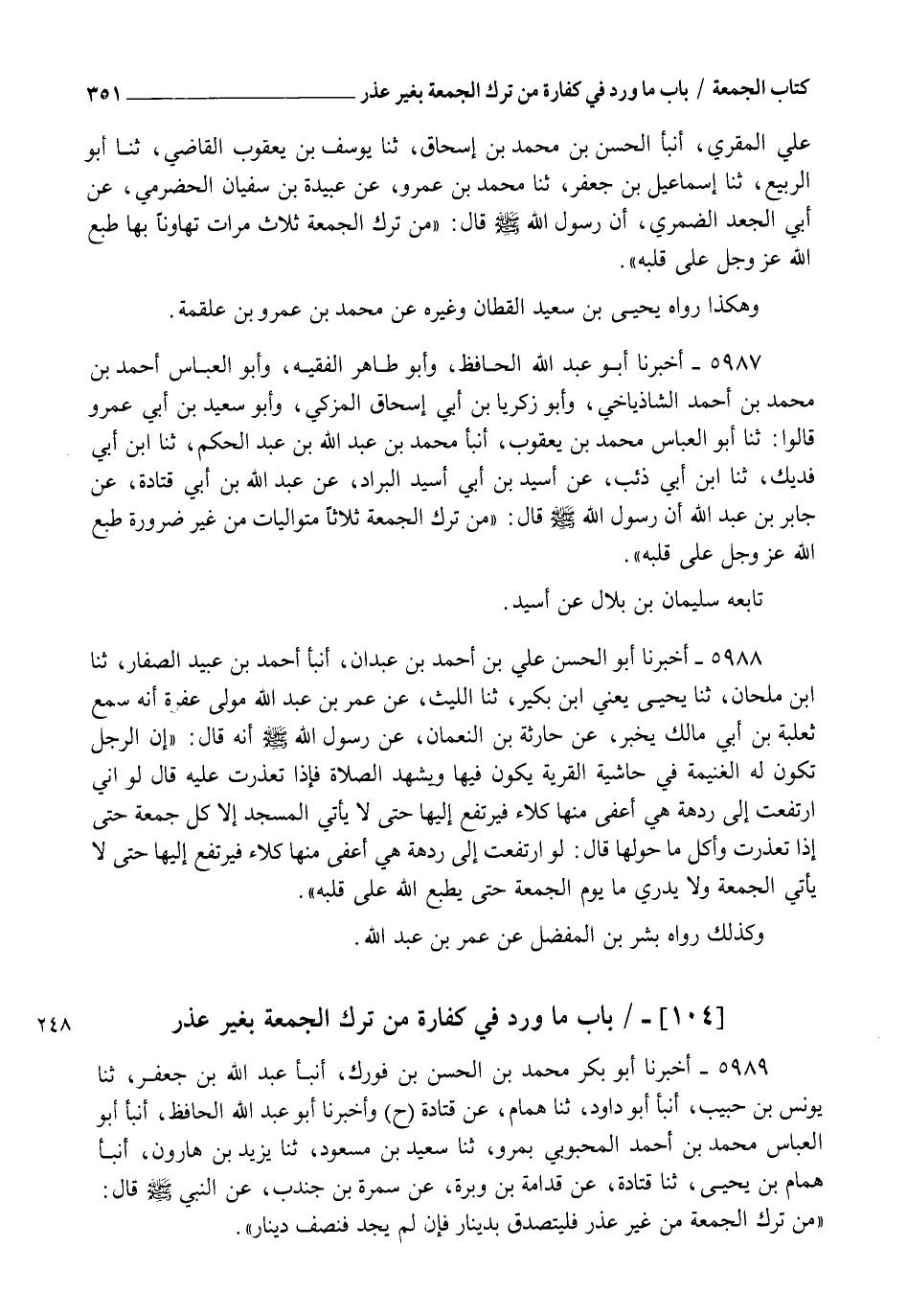5987 - أَخْبَرَنَا أَبُو عَبْدِ اللهِ الْحَافِظُ، وَأَبُو طَاهِرٍ الْفَقِيهُ وَأَبُو الْعَبَّاسِ أَحْمَدُ بْنُ مُحَمَّدِ بْنِ أَحْمَدَ الشَّاذْيَاخِيُّ، وَأَبُو زَكَرِيَّا بْنُ أَبِي إِسْحَاقَ الْمُزَكِّي، وَأَبُو سَعِيدِ بْنُ أَبِي عَمْرٍو قَالُوا: ثنا أَبُو الْعَبَّاسِ مُحَمَّدُ بْنُ يَعْقُوبَ، أنبأ مُحَمَّدُ بْنُ عَبْدِ اللهِ بْنِ عَبْدِ الْحَكَمِ، ثنا ابْنُ أَبِي فُدَيْكٍ، ثنا ابْنُ أَبِي ذِئْبٍ، عَنْ أَسِيدِ بْنِ أَبِي أَسِيدٍ الْبَرَّادِ، عَنْ عَبْدِ اللهِ بْنِ أَبِي قَتَادَةَ، عَنْ جَابِرِ بْنِ عَبْدِ اللهِ، أَنَّ رَسُولَ اللهِ صَلَّى اللهُ عَلَيْهِ وَسَلَّمَ قَالَ: " §مَنْ تَرَكَ الْجُمُعَةَ ثَلَاثًا مُتَوَالِيَاتٍ مِنْ غَيْرِ ضَرُورَةٍ، طَبَعَ اللهُ عَزَّ وَجَلَّ عَلَى قَلْبِهِ ". تَابَعَهُ سُلَيْمَانُ بْنُ بِلَالٍ، عَنْ أَسِيدٍ