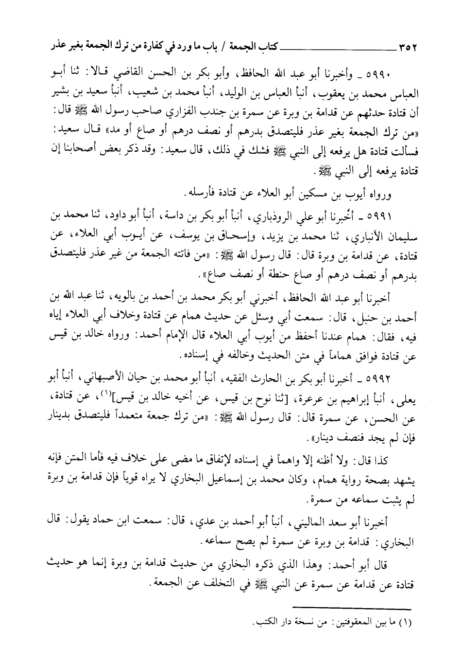 5991 - أَخْبَرَنَا أَبُو عَلِيٍّ الرُّوذْبَارِيُّ، أنبأ أَبُو بَكْرِ بْنُ دَاسَةَ، أنبأ أَبُو دَاوُدَ، ثنا مُحَمَّدُ بْنُ سُلَيْمَانَ الْأَنْبَارِيُّ، ثنا مُحَمَّدُ بْنُ يَزِيدَ، وَإِسْحَاقُ بْنُ يُوسُفَ، عَنْ أَيُّوبَ أَبِي الْعَلَاءِ، عَنْ قَتَادَةَ، عَنْ قُدَامَةَ بْنِ وَبَرَةَ قَالَ: قَالَ رَسُولُ اللهِ صَلَّى اللهُ عَلَيْهِ وَسَلَّمَ: " §مَنْ فَاتَتْهُ الْجُمُعَةُ مِنْ غَيْرِ عُذْرٍ فَلْيَتَصَدَّقْ بِدِرْهَمٍ، أَوْ نِصْفِ دِرْهَمٍ، أَوْ صَاعِ حِنْطَةٍ، أَوْ نِصْفِ صَاعٍ ". أَخْبَرَنَا أَبُو عَبْدِ اللهِ الْحَافِظُ، أَخْبَرَنِي أَبُو بَكْرٍ مُحَمَّدُ بْنُ أَحْمَدَ بْنِ بَالَوَيْهٍ، ثنا عَبْدُ اللهِ بْنُ أَحْمَدَ بْنِ حَنْبَلٍ قَالَ: سَمِعْتُ أَبِي وَسُئِلَ عَنْ حَدِيثِ هَمَّامٍ عَنْ قَتَادَةَ، وَخِلَافِ أَبِي الْعَلَاءِ إِيَّاهُ فِيهِ، فَقَالَ: هَمَّامٌ عِنْدَنَا أَحْفَظُ مِنْ أَيُّوبَ أَبِي الْعَلَاءِ. قَالَ الْإِمَامُ أَحْمَدُ: وَرَوَاهُ خَالِدُ بْنُ قَيْسٍ عَنْ قَتَادَةَ فَوَافَقَ هَمَّامًا فِي مَتْنِ الْحَدِيثِ وَخَالَفَهُ فِي إِسْنَادِهِ