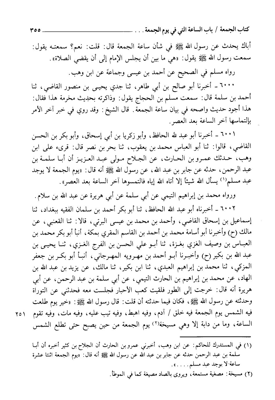 6001 - أَخْبَرَنَا أَبُو عَبْدِ اللهِ الْحَافِظُ، وَأَبُو زَكَرِيَّا بْنُ أَبِي إِسْحَاقَ وَأَبُو بَكْرِ بْنُ الْحَسَنِ الْقَاضِي، قَالُوا ثنا أَبُو الْعَبَّاسِ مُحَمَّدُ بْنُ يَعْقُوبَ ثنا بَحْرُ بْنُ نَصْرٍ قَالَ: قُرِئَ عَلَى ابْنِ وَهْبٍ: حَدَّثَكَ عَمْرُو بْنُ الْحَارِثِ، عَنِ الْجَلَّاحِ مَوْلَى عَبْدِ الْعَزِيزِ أَنَّ أَبَا سَلَمَةَ بْنَ عَبْدِ الرَّحْمَنِ حَدَّثَهُ، عَنْ جَابِرِ بْنِ عَبْدِ اللهِ، عَنْ رَسُولِ اللهِ صَلَّى اللهُ عَلَيْهِ وَسَلَّمَ أَنَّهُ قَالَ: §" يَوْمُ الْجُمُعَةِ لَا يُوجَدُ عَبْدٌ مُسْلِمٌ يَسْأَلُ اللهَ شَيْئًا إِلَّا آتَاهُ اللهُ إِيَّاهُ، فَالْتَمِسُوهَا آخِرَ السَّاعَةِ بَعْدَ الْعَصْرِ ". وَرَوَاهُ مُحَمَّدُ بْنُ إِبْرَاهِيمَ التَّيْمِيُّ عَنْ أَبِي سَلَمَةَ عَنْ أَبِي هُرَيْرَةَ عَنْ عَبْدِ اللهِ بْنِ سَلَامٍ