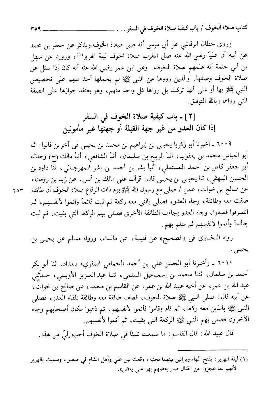 6010 - وَأَخْبَرَنَا أَبُو الْحَسَنِ عَلِيُّ بْنُ أَحْمَدَ الْحَمَامِيُّ الْمُقْرِئُّ بِبَغْدَادَ، ثنا أَبُو بَكْرٍ أَحْمَدُ بْنُ سَلْمَانَ، ثنا مُحَمَّدُ بْنُ إِسْمَاعِيلَ السُّلَمِيُّ، ثنا عَبْدُ الْعَزِيزِ الْأُوَيْسِيُّ، حَدَّثَنِي عَبْدُ اللهِ بْنُ عُمَرَ، عَنْ أَخِيهِ عُبَيْدِ اللهِ بْنِ عُمَرَ، عَنِ الْقَاسِمِ بْنِ مُحَمَّدٍ، عَنْ صَالِحِ بْنِ خَوَّاتٍ، عَنْ أَبِيهِ. قَالَ: صَلَّى النَّبِيُّ صَلَّى اللهُ عَلَيْهِ وَسَلَّمَ: " §صَلَاةُ الْخَوْفِ، فَصَفَّ طَائِفَةً مَعَهُ , وَطَائِفَةٌ تِلْقَاءَ الْعَدُوِّ، فَصَلَّى النَّبِيُّ صَلَّى اللهُ عَلَيْهِ وَسَلَّمَ بِالَّذِينَ مَعَهُ رَكْعَةً، ثُمَّ قَامَ وَقَامُوا، فَأَتَمُّوا لِأَنْفُسِهِمْ، ثُمَّ ذَهَبُوا مَكَانَ أَصْحَابِهِمْ وَجَاءَ الْآخَرُونَ، فَصَلَّى بِهِمُ النَّبِيُّ صَلَّى اللهُ عَلَيْهِ وَسَلَّمَ الرَّكْعَةَ الَّتِي بَقِيَتْ، ثُمَّ أَتَمُّوا لِأَنْفُسِهِمْ ". قَالَ عُبَيْدُ اللهِ: قَالَ الْقَاسِمُ: مَا سَمِعْتُ شَيْئًا فِي صَلَاةِ الْخَوْفِ أَحَبَّ إِلَيَّ مِنْ هَذَا "