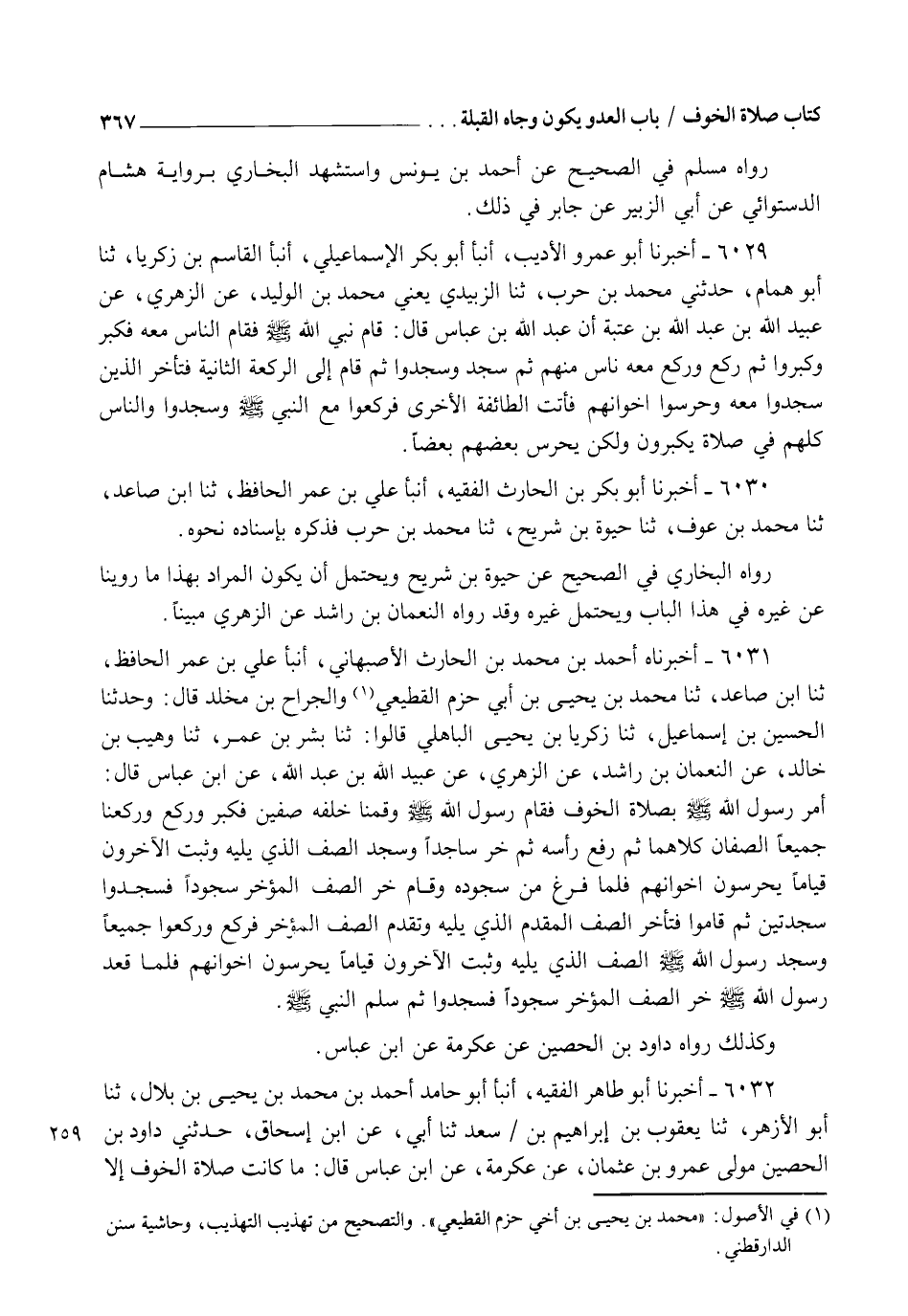 6031 - أَخْبَرَنَاهُ أَحْمَدُ بْنُ مُحَمَّدِ بْنِ الْحَارِثِ الْأَصْبَهَانِيُّ، أنبأ عَلِيُّ بْنُ عُمَرَ الْحَافِظُ، ثنا ابْنُ صَاعِدٍ، ثنا مُحَمَّدُ بْنُ يَحْيَى بْنِ أَبِي حَزْمٍ الْقَطِيعِيُّ، وَالْجَرَّاحُ بْنُ مَخْلَدٍ قَالَ: وَحَدَّثَنَا الْحُسَيْنُ بْنُ إِسْمَاعِيلَ، ثنا زَكَرِيَّا بْنُ يَحْيَى الْ بَاهِلِيُّ، قَالُوا ثنا بِشْرُ بْنُ عُمَرَ، ثنا وُهَيْبُ بْنُ خَالِدٍ، عَنِ النُّعْمَانِ بْنِ رَاشِدٍ، عَنِ الزُّهْرِيِّ، عَنْ عُبَيْدِ اللهِ بْنِ عَبْدِ اللهِ، عَنِ ابْنِ عَبَّاسٍ قَالَ: §" أَمَرَ رَسُولُ اللهِ صَلَّى اللهُ عَلَيْهِ وَسَلَّمَ بِصَلَاةِ الْخَوْفِ فَقَامَ رَسُولُ اللهِ صَلَّى اللهُ عَلَيْهِ وَسَلَّمَ وَقُمْنَا خَلْفَهُ صَفَّينِ , فَكَبَّرَ وَرَكَعَ وَرَكَعْنَا جَمِيعًا , الصَّفَّانِ كِلَاهُمَا، ثُمَّ رَفَعَ رَأْسَهُ ثُمَّ خَرَّ سَاجِدًا وَسَجَدَ الصَّفُّ الَّذِي يَلِيهِ وَثَبَتَ الْآخَرُونَ قِيَامًا يَحْرُسُونَ إِخْوَانَهُمْ، فَلَمَّا فَرَغَ مِنْ سُجُودِهِ وَقَامَ خَرَّ الصَّفُّ الْمُؤَخَّرُ سُجُودًا، فَسَجَدُوا سَجْدَتَيْنِ ثُمَّ قَامُوا، فَتَأَخَّرَ الصَّفُّ الْمُقَدَّمُ الَّذِي يَلِيهِ، وَتَقَدَّمَ الصَّفُّ الْمُؤَخَّرُ فَرَكَعَ وَرَكَعُوا جَمِيعًا , وَسَجَدَ رَسُولُ اللهِ صَلَّى اللهُ عَلَيْهِ وَسَلَّمَ وَالصَّفُّ الَّذِي يَلِيهِ، وَثَبَتَ الْآخَرُونَ قِيَامًا يَحْرُسُونَ إِخْوَانَهُمْ , فَلَمَّا قَعَدَ رَسُولُ اللهِ صَلَّى اللهُ عَلَيْهِ وَسَلَّمَ خَرَّ الصَّفُّ الْمُؤَخَّرُ سُجُودًا فَسَجَدُوا ثُمَّ سَلَّمَ النَّبِيُّ صَلَّى اللهُ عَلَيْهِ وَسَلَّمَ ". وَكَذَلِكَ رَوَاهُ دَاوُدُ بْنُ الْحُصَيْنِ عَنْ عِكْرِمَةَ عَنِ ابْنِ عَبَّاسٍ