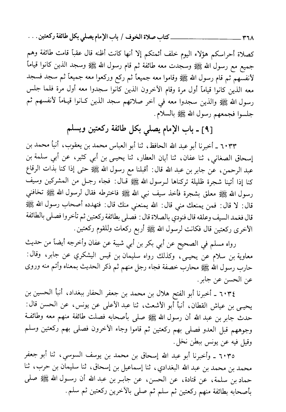 6033 - أَخْبَرَنَا أَبُو عَبْدِ اللهِ الْحَافِظُ، ثنا أَبُو الْعَبَّاسِ مُحَمَّدُ بْنُ يَعْقُوبَ , أنبأ مُحَمَّدُ بْنُ إِسْحَاقَ الصَّغَانِيُّ، ثنا عَفَّانُ، ثنا أَبَانُ الْعَطَّارُ، ثنا يَحْيَى بْنُ أَبِي كَثِيرٍ، عَنْ أَبِي سَلَمَةَ بْنِ عَبْدِ الرَّحْمَنِ، عَنْ جَابِرِ بْنِ عَبْدِ اللهِ قَالَ: أَقْبَلْنَا مَعَ رَسُولِ اللهِ صَلَّى اللهُ عَلَيْهِ وَسَلَّمَ حَتَّى إِذَا كُنَّا بِذَاتِ الرِّقَاعِ كُنَّا إِذَا أَتَيْنَا شَجَرَةً ظَلِيلَةً تَرَكْنَاهَا لِرَسُولِ اللهِ صَلَّى اللهُ عَلَيْهِ وَسَلَّمَ قَالَ: فَجَاءَ رَجُلٌ مِنَ الْمُشْرِكِينَ وَسَيْفُ رَسُولِ اللهِ صَلَّى اللهُ عَلَيْهِ وَسَلَّمَ مُعَلَّقٌ بِشَجَرَةٍ، فَأَخَذَ سَيْفَ نَبِيِّ اللهِ صَلَّى اللهُ عَلَيْهِ وَسَلَّمَ فَاخْتَرَطَهُ , فَقَالَ لِرَسُولِ اللهِ صَلَّى اللهُ عَلَيْهِ وَسَلَّمَ: تَخَافُنِي؟ قَالَ: " لَا " , قَالَ: فَمَنْ يمْنَعُكَ مِنِّي؟ قَالَ: " §اللهُ يَمْنَعُنِي مِنْكَ " قَالَ: فَتَهَدَّدَهُ أَصْحَابُ رَسُولِ اللهِ صَلَّى اللهُ عَلَيْهِ وَسَلَّمَ , قَالَ: فَغَمَدَ السَّيْفَ وَعَلَّقَهُ , قَالَ: فَنُودِيَ بِالصَّلَاةِ، قَالَ: فَصَلَّى بِطَائِفَةٍ رَكْعَتَيْنِ , ثُمَّ تَأَخَّرُوا فَصَلَّى بِالطَّائِفَةِ الْأُخْرَى رَكْعَتَيْنِ , قَالَ: فَكَانَتْ لِرَسُولِ اللهِ صَلَّى اللهُ عَلَيْهِ وَسَلَّمَ أَرْبَعُ رَكَعَاتٍ وَلِلْقَوْمِ رَكْعَتَيْنِ ". رَوَاهُ مُسْلِمٌ فِي الصَّحِيحِ , عَنْ أَبِي بَكْرِ بْنِ أَبِي شَيْبَةَ , عَنْ عَفَّانَ، وَأَخْرَجَهُ أَيْضًا مِنْ حَدِيثِ مُعَاوِيَةَ بْنِ سَلَّامٍ عَنْ يَحْيَى. وَكَذَلِكَ رَوَاهُ سُلَيْمَانُ بْنُ قَيْسٍ الْيَشْكُرِيُّ عَنْ جَابِرٍ , وَقَالَ: " حَارَبَ رَسُولُ اللهِ صَلَّى اللهُ عَلَيْهِ وَسَلَّمَ مُحَارِبَ خَصَفَةَ , فَجَاءَ رَجُلٌ مِنْهُمْ، ثُمَّ ذَكَرَ الْحَدِيثَ بِمَعْنَاهُ وَأَتَمَّ مِنْهُ، وَرُوِيَ عَنِ الْحَسَنِ عَنْ جَابِرٍ