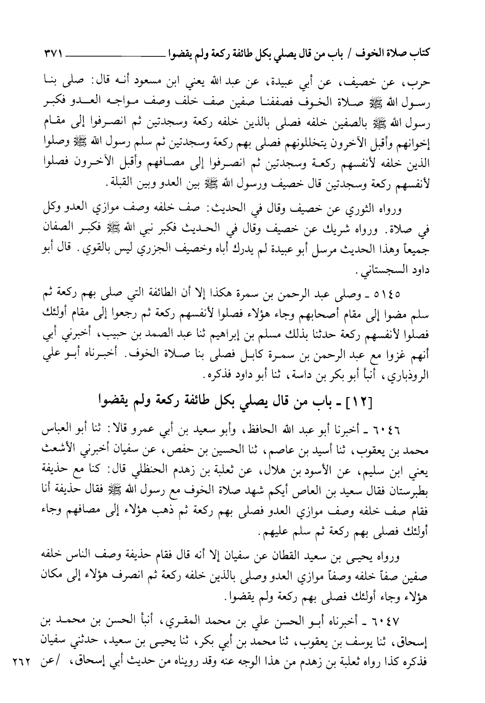 6045 - §" وَصَلَّى عَبْدُ الرَّحْمَنِ بْنُ سَمُرَةَ هَكَذَا , إِلَّا أَنَّ الطَّائِفَةَ الَّتِي صَلَّى بِهِمْ رَكْعَةً ثُمَّ سَلَّمَ مَضَوْا إِلَى مَقَامِ أَصْحَابِهِمْ، وَجَاءَ هَؤُلَاءِ فَصَلُّوا لِأَنْفُسِهِمْ رَكْعَةً، ثُمَّ رَجَعُوا إِلَى مَقَامِ أُولَئِكَ فَصَلُّوا لِأَنْفُسِهِمْ رَكْعَةً ". حَدَّثَنَا بِذَلِكَ مُسْلِمُ بْنُ إِبْرَاهِيمَ , ثنا عَبْدُ الصَّمَدِ بْنُ حَبِيبٍ , أَخْبَرَنِي أَبِي " أَنَّهُمْ غَزَوْا مَعَ عَبْدِ الرَّحْمَنِ بْنِ سَمُرَةَ كَابُلَ فَصَلَّى بِنَا صَلَاةَ الْخَوْفِ ". أَخْبَرَنَاهُ أَبُو عَلِيٍّ الرُّوذْبَارِيُّ , أنبأ أَبُو بَكْرِ بْنُ دَاسَةَ , ثنا أَبُو دَاوُدَ , فَذَكَرَهُ