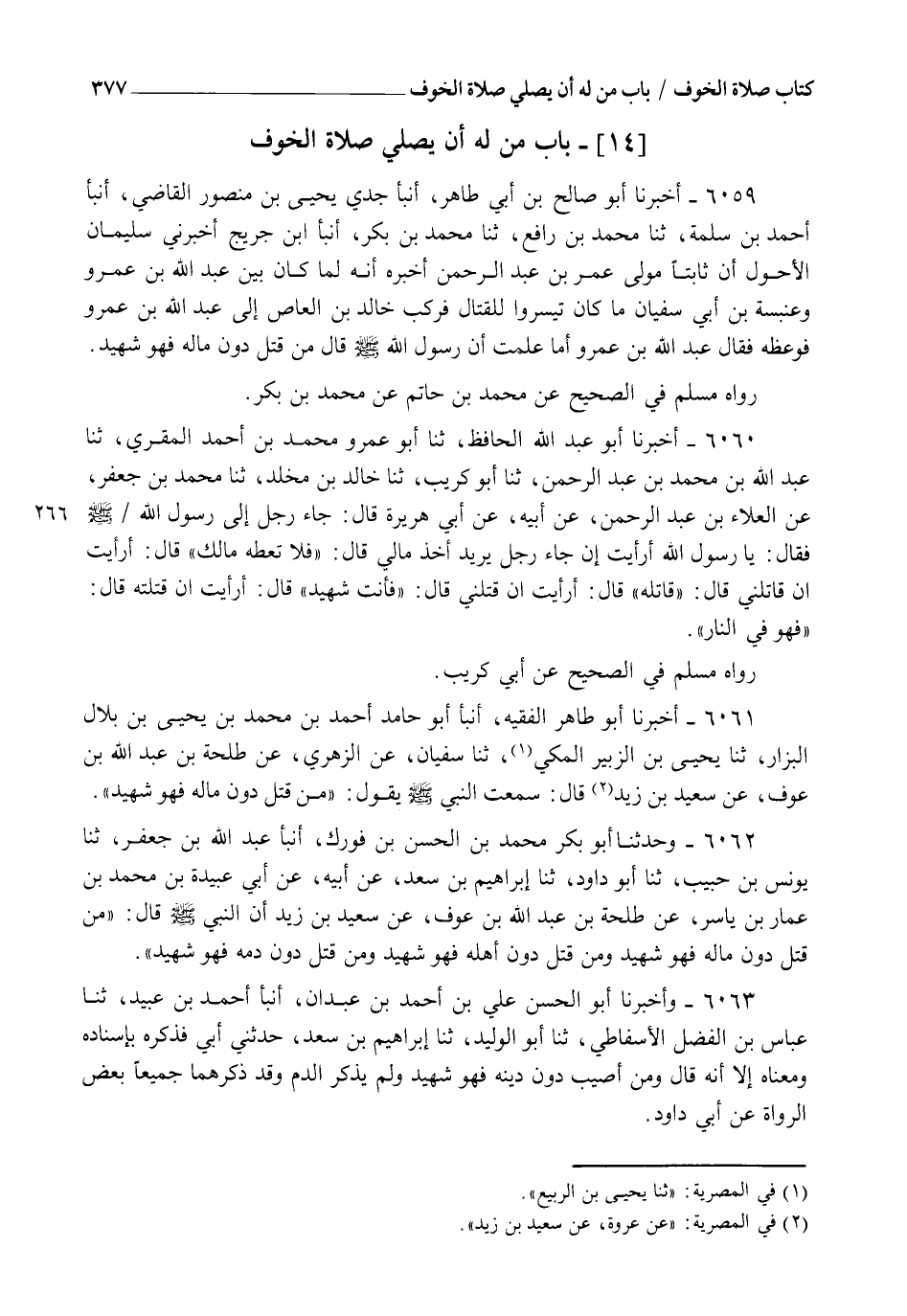 6059 - أَخْبَرَنَا أَبُو صَالِحِ بْنُ أَبِي طَاهِرٍ، أنبأ جَدِّي يَحْيَى بْنُ مَنْصُورٍ الْقَاضِي , أنبأ أَحْمَدُ بْنُ سَلَمَةَ، ثنا مُحَمَّدُ بْنُ رَافِعٍ، ثنا مُحَمَّدُ بْنُ بَكْرٍ، أنبأ ابْنُ جُرَيْجٍ، أَخْبَرَنِي سُلَيْمَانُ الْأَحْوَلُ، أَنَّ ثَابِتًا مَوْلَى عُمَرَ بْنِ عَبْدِ الرَّحْمَنِ أَخْبَرَهُ أَنَّهُ: " لَمَّا كَانَ بَيْنَ عَبْدِ اللهِ بْنِ عَمْرٍو، وَعَنْبَسَةَ بْنِ أَبِي سُفْيَانَ مَا كَانَ تَيَسَّرُوا لِلْقِتَالِ، فَرَكِبَ خَالِدُ بْنُ الْعَاصِ إِلَى عَبْدِ اللهِ بْنِ عَمْرٍو فَوَعَظَهُ، فَقَالَ عَبْدُ اللهِ بْنُ عَمْرٍو: أَمَا عَلِمْتَ أَنَّ رَسُولَ اللهِ صَلَّى اللهُ عَلَيْهِ وَسَلَّمَ قَالَ: §" مَنْ قُتِلَ دُونَ مَالِهِ فَهُوَ شَهِيدٌ ". رَوَاهُ مُسْلِمٌ فِي الصَّحِيحِ عَنْ مُحَمَّدِ بْنِ حَاتِمٍ , عَنْ مُحَمَّدِ بْنِ بَكْرٍ