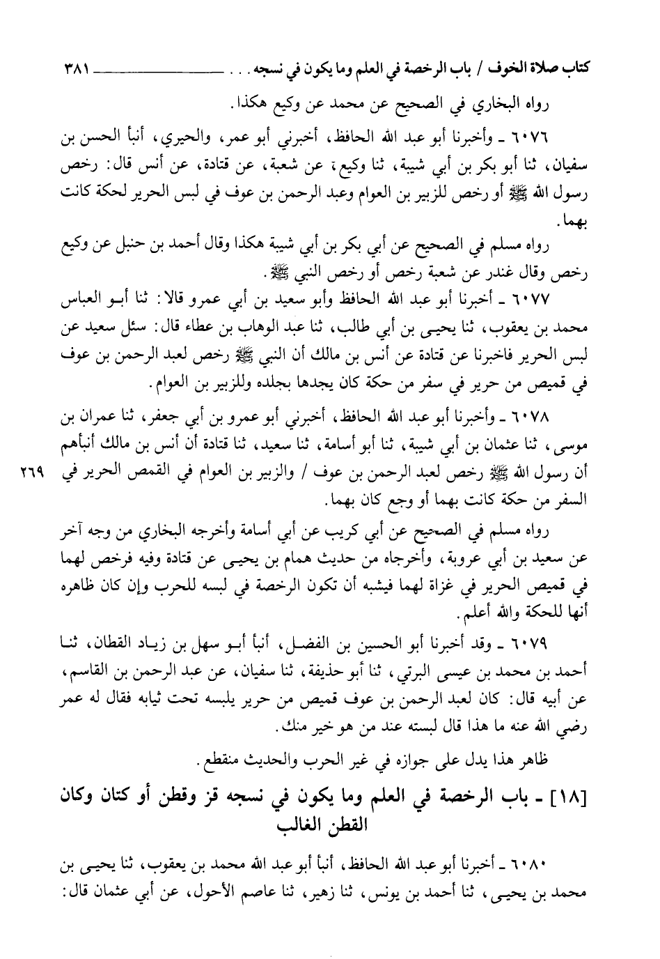 6078 - وَأَخْبَرَنَا أَبُو عَبْدِ اللهِ الْحَافِظُ، أَخْبَرَنِي أَبُو عَمْرِو بْنُ أَبِي جَعْفَرٍ، ثنا عِمْرَانُ بْنُ مُوسَى، ثنا عُثْمَانُ بْنُ أَبِي شَيْبَةَ، ثنا أَبُو أُسَامَةَ، ثنا سَعِيدٌ، ثنا قَتَادَةُ، أَنَّ أَنَسَ بْنَ مَالِكٍ أَنْبَأَهُمْ: " أَنَّ رَسُولَ اللهِ صَلَّى اللهُ عَلَيْهِ وَسَلَّمَ §رَخَّصَ لِعَبْدِ الرَّحْمَنِ بْنِ عَوْفٍ وَالزُّبَيْرِ بْنِ الْعَوَّامِ فِي الْقُمُصِ الْحَرِيرِ فِي السَّفَرِ مِنْ حِكَّةٍ كَانَتْ بِهِمَا، أَوْ وَجَعٍ كَانَ بِهِمَا ". رَوَاهُ مُسْلِمٌ فِي الصَّحِيحِ , عَنْ أَبِي كُرَيْبٍ , عَنْ أَبِي أُسَامَةَ، وَأَخْرَجَهُ الْبُخَارِيُّ مِنْ وَجْهٍ آخَرَ عَنْ سَعِيدِ بْنِ أَبِي عَرُوبَةَ، وَأَخْرَجَاهُ مِنْ حَدِيثِ هَمَّامِ بْنِ يَحْيَى , عَنْ قَتَادَةَ وَفِيهِ: " فَرَخَّصَ لَهُمَا فِي قَمِيصِ الْحَرِيرِ فِي غَزَاةٍ لَهُمَا ". فَيُشْبِهُ أَنْ تَكُونَ الرُّخْصَةُ فِي لُبِسِهِ لِلْحَرْبِ، وَإِنْ كَانَ ظَاهِرُهُ أَنَّهَا لِلْحِكَّةِ , وَاللهُ أَعْلَمُ