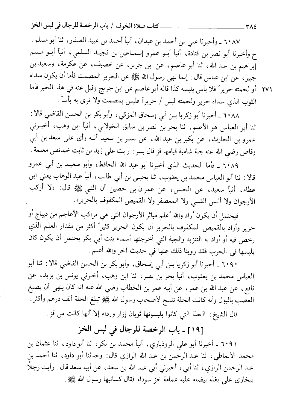6088 - أَخْبَرَنَا أَبُو زَكَرِيَّا بْنُ أَبِي إِسْحَاقَ الْمُزَكِّي، وَأَبُو بَكْرِ بْنُ الْحَسَنِ الْقَاضِي قَالَا: ثنا أَبُو الْعَبَّاسِ هُوَ الْأَصَمُّ , ثنا بَحْرُ بْنُ نَصْرِ بْنِ سَابِقٍ الْخَوْلَانِيُّ، أنبأ ابْنُ وَهْبٍ، أَخْبَرَنِي عَمْرُو بْنُ الْحَارِثِ، عَنْ بُكَيْرِ بْنِ عَبْدِ اللهِ، عَنْ بُسْرِ بْنِ سَعِيدٍ: " أَنَّهُ §رَأَى عَلَى سَعْدِ بْنِ أَبِي وَقَّاصٍ رَضِيَ اللهُ عَنْهُ جُبَّةً شَامِيَّةً قِيَامُهَا قَزٌّ " , قَالَ بُسْرٌ: رَأَيْتُ عَلَى زَيْدِ بْنِ ثَابِتٍ خَمَائِصَ مُعَلَّمَةً "