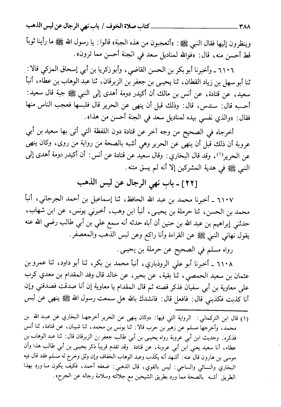 6106 - وَأَخْبَرَنَا أَبُو بَكْرِ بْنُ الْحَسَنِ الْقَاضِي، وَأَبُو زَكَرِيَّا بْنُ أَبِي إِسْحَاقَ الْمُزَكِّي قَالَا: ثنا أَبُو سَهْلِ بْنُ زِيَادٍ الْقَطَّانُ، ثنا يَحْيَى بْنُ جَعْفَرِ بْنِ الزِّبْرِقَانِ، ثنا عَبْدُ الْوَهَّابِ بْنُ عَطَاءٍ، أنبأ سَعِيدٌ، عَنْ قَتَادَةَ، عَنْ أَنَسِ بْنِ مَالِكٍ، أَنَّ أُكَيْدِرَ دَوْمَةَ أَهْدَى إِلَى النَّبِيِّ صَلَّى اللهُ عَلَيْهِ وَسَلَّمَ جُبَّةً، قَالَ سَعِيدٌ: أَحْسَبُهُ قَالَ: سُنْدُسٍ , قَالَ: وَذَلِكَ قَبْلَ أَنْ يَنْهَى عَنِ الْحَرِيرِ، قَالَ: فَلَبِسَهَا، فَعَجِبَ النَّاسُ مِنْهَا، فَقَالَ: " وَالَّذِي نَفْسِي بِيَدِهِ، §لَمَنَادِيلُ سَعْدٍ فِي الْجَنَّةِ أَحْسَنُ مِنْ هَذَا ". أَخْرَجَاهُ فِي الصَّحِيحِ مِنْ وَجْهٍ آخَرَ عَنْ قَتَادَةَ دُونَ اللَّفْظَةِ الَّتِي أَتَى بِهَا سَعِيدُ بْنُ أَبِي عَرُوبَةَ أَنَّ ذَلِكَ قَبْلَ أَنْ يَنْهَى عَنِ الْحَرِيرِ , وَهِيَ أَشْبَهُ بِالصِّحَّةِ مِنْ رِوَايَةِ مَنْ رَوَى وَكَانَ يَنْهَى عَنِ الْحَرِيرِ , وَقَدْ قَالَ الْبُخَارِيُّ: وَقَالَ سَعِيدٌ عَنْ قَتَادَةَ , عَنْ أَنَسٍ: إِنَّ أُكَيْدِرَ دُومَةَ أَهْدَى إِلَى النَّبِيِّ صَلَّى اللهُ عَلَيْهِ وَسَلَّمَ فِي هَدِيَّةِ الْمُشْرِكِينَ، إِلَّا أَنَّهُ لَمْ يَسُقْ مَتْنَهُ