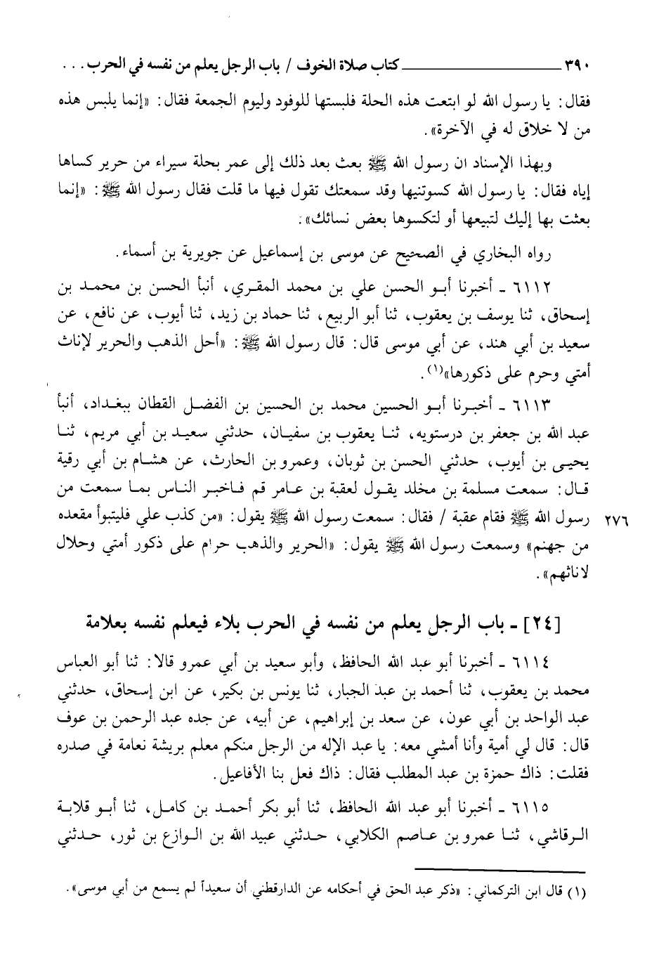 6115 - أَخْبَرَنَا أَبُو عَبْدِ اللهِ الْحَافِظُ، ثنا أَبُو بَكْرٍ أَحْمَدُ بْنُ كَامِلٍ , ثنا أَبُو قِلَابَةَ الرَّقَاشِيُّ، ثنا عَمْرُو بْنُ عَاصِمٍ الْكِلَابِيُّ، حَدَّثَنِي عُبَيْدُ اللهِ بْنُ الْوَازِعِ بْنِ ثَوْرٍ، حَدَّثَنِي -[391]- هِشَامُ بْنُ عُرْوَةَ، عَنْ أَبِيهِ، عَنِ الزُّبَيْرِ بْنِ الْعَوَّامِ فِي قِصَّةِ أَبِي دُجَانَةَ سِمَاكِ بْنِ خَرَشَةَ يَوْمَ أُحُدٍ، وَدَفَعَ النَّبِيُّ صَلَّى اللهُ عَلَيْهِ وَسَلَّمَ سَيْفَهُ إِلَيْهِ قَالَ: §" وَكَانَ إِذَا أَرَادَ الْقِتَالَ أَعْلَمَ بِعُصَابَةٍ "