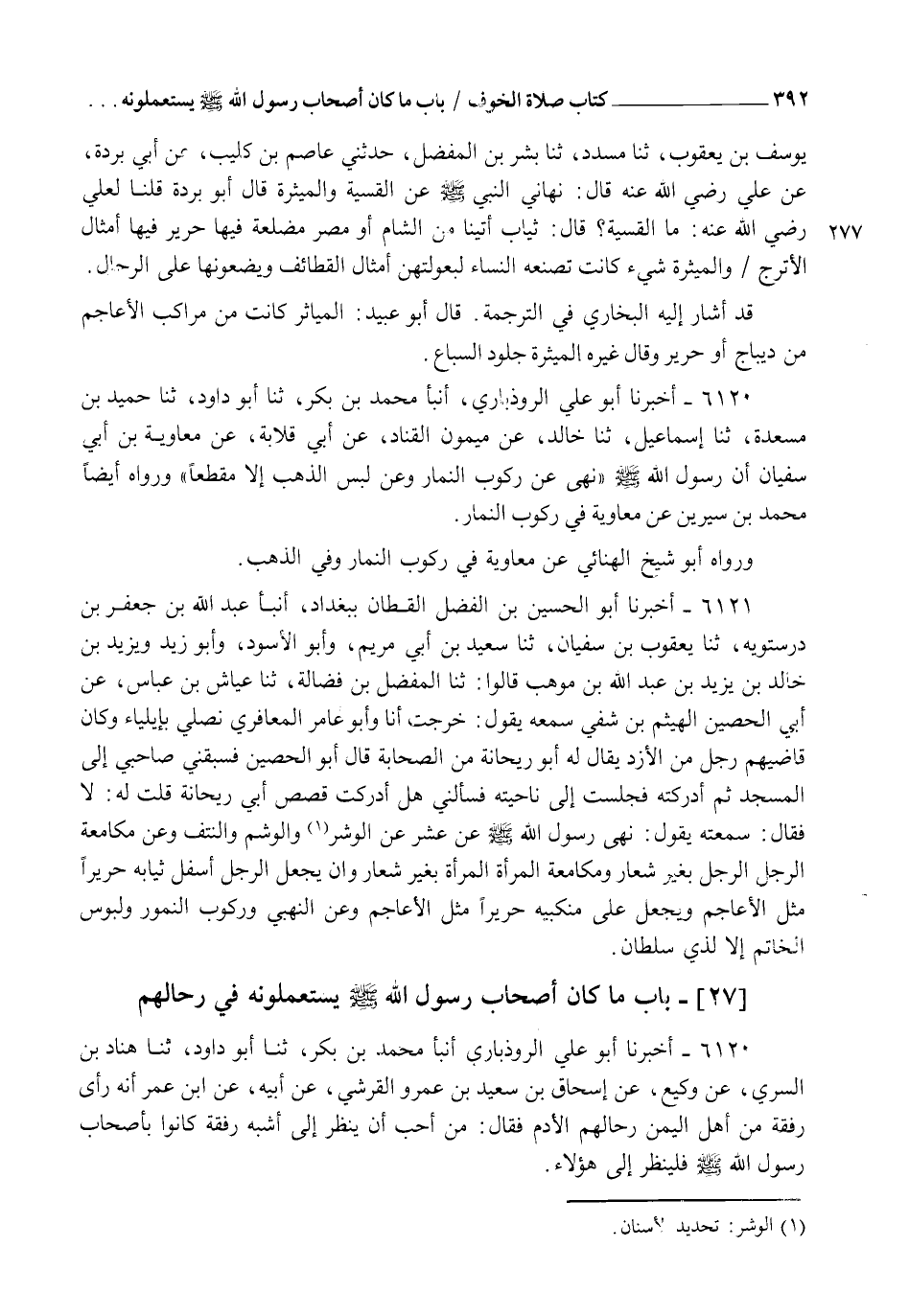6120 - أَخْبَرَنَا أَبُو عَلِيٍّ الرُّوذْبَارِيُّ، أنبأ مُحَمَّدُ بْنُ بَكْرٍ، ثنا أَبُو دَاوُدَ، ثنا حُمَيْدُ بْنُ مَسْعَدَةَ، ثنا إِسْمَاعِيلُ، ثنا خَالِدٌ، عَنْ مَيْمُونٍ الْقَنَّادِ، عَنْ أَبِي قِلَابَةَ، عَنْ مُعَاوِيَةَ بْنِ أَبِي سُفْيَانَ " أَنَّ رَسُولَ اللهِ صَلَّى اللهُ عَلَيْهِ وَسَلَّمَ §نَهَى عَنْ رُكُوبِ النِّمَارِ، وَعَنْ لُبْسِ الذَّهَبِ إِلَّا مُقَطَّعًا ". وَرَوَاهُ أَيْضًا مُحَمَّدُ بْنُ سِيرِينَ , عَنْ مُعَاوِيَةَ فِي رُكُوبِ النِّمَارِ. وَرَوَاهُ أَبُو شَيْخٍ الْهُنَائِيُّ , عَنْ مُعَاوِيَةَ فِي رُكُوبِ النِّمَارِ وَفِي الذَّهَبِ