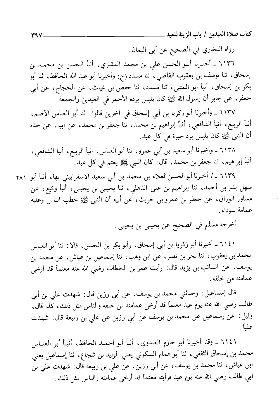 6138 - وَأَخْبَرَنَا أَبُو سَعِيدِ بْنُ أَبِي عَمْرٍو، ثنا أَبُو الْعَبَّاسِ، أنبأ الرَّبِيعُ، أنبأ الشَّافِعِيُّ، أنبأ إِبْرَاهِيمُ، ثنا جَعْفَرُ بْنُ مُحَمَّدٍ قَالَ: " كَانَ النَّبِيُّ صَلَّى اللهُ عَلَيْهِ وَسَلَّمَ §يَعْتَمُّ فِي كُلِّ عِيدٍ "