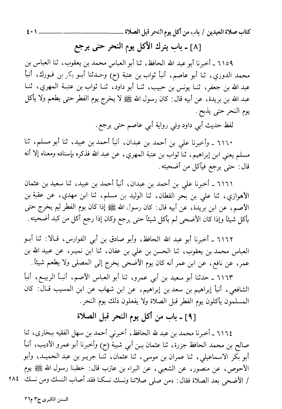 6162 - أَخْبَرَنَا أَبُو عَبْدِ اللهِ الْحَافِظُ، وَأَبُو صَادِقِ بْنُ أَبِي الْفَوَارِسِ، قَالَا: ثنا أَبُو الْعَبَّاسِ مُحَمَّدُ بْنُ يَعْقُوبَ , ثنا الْحَسَنُ بْنُ عَلِيِّ بْنِ عَفَّانَ، ثنا ابْنُ نُمَيْرٍ، عَنْ عُبَيْدِ اللهِ بْنِ عُمَرَ، عَنْ نَافِعٍ، عَنِ ابْنِ عُمَرَ " أَنَّهُ §كَانَ يَوْمَ الْأَضْحَى يَخْرُجُ إِلَى الْمُصَلَّى وَلَا يَطْعَمُ شَيْئًا "