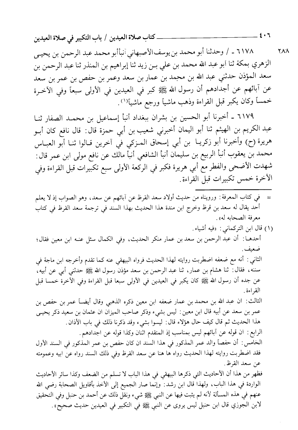6178 - وَحَدَّثَنَا أَبُو مُحَمَّدِ بْنُ يُوسُفَ الْأَصْبَهَانِيُّ، أنبأ أَبُو مُحَمَّدٍ عَبْدُ الرَّحْمَنِ بْنُ يَحْيَى الزُّهْرِيُّ بِمَكَّةَ , ثنا أَبُو عَبْدِ اللهِ مُحَمَّدُ بْنُ عَلِيِّ بْنِ زَيْدٍ , ثنا إِبْرَاهِيمُ بْنُ الْمُنْذِرِ، ثنا عَبْدُ الرَّحْمَنِ بْنُ سَعْدٍ الْمُؤَذِّنُ، حَدَّثَنِي عَبْدُ اللهِ بْنُ مُحَمَّدِ بْنِ عَمَّارِ بْنِ سَعْدٍ، وَعُمَرُ بْنُ حَفْصِ بْنِ عُمَرَ بْنِ سَعْدٍ، عَنْ آبَائِهِمْ، عَنْ أَجْدَادِهِمْ، " أَنَّ رَسُولَ اللهِ صَلَّى اللهُ عَلَيْهِ وَسَلَّمَ §كَبَّرَ فِي الْعِيدَيْنِ فِي الْأُولَى سَبْعًا، وَفِي الْآخِرَةِ خَمْسًا، وَكَانَ يُكَبِّرُ قَبْلَ الْقِرَاءَةِ , وَذَهَبَ مَاشِيًا وَرَجَعَ مَاشِيًا "