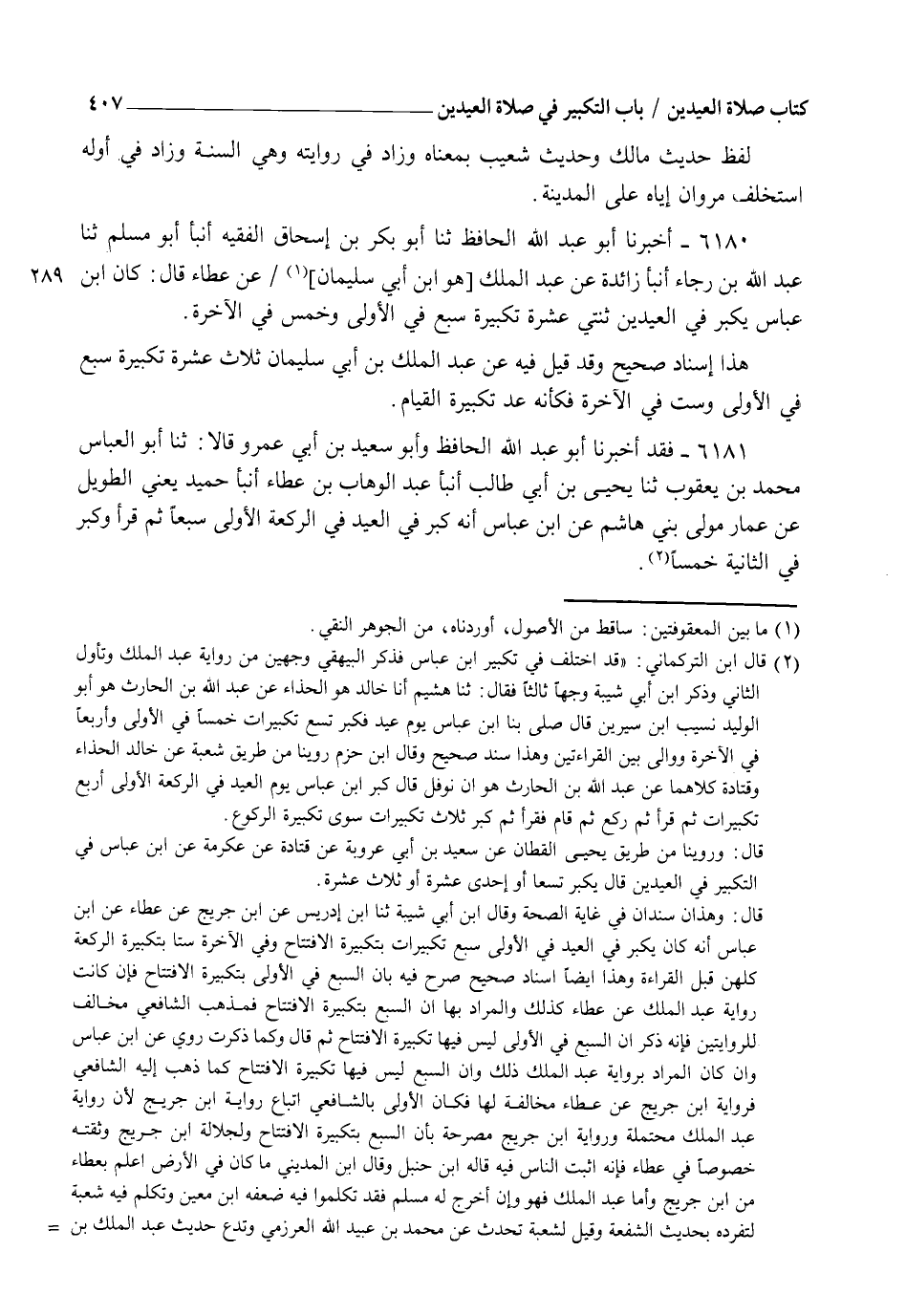 6180 - أَخْبَرَنَا أَبُو عَبْدِ اللهِ الْحَافِظُ، ثنا أَبُو بَكْرِ بْنُ إِسْحَاقَ الْفَقِيهُ، أنبأ أَبُو مُسْلِمٍ، ثنا عَبْدُ اللهِ بْنُ رَجَاءٍ، أنبأ زَائِدَةُ، عَنْ عَبْدِ الْمَلِكِ، عَنْ عَطَاءٍ قَالَ: §" كَانَ ابْنُ عَبَّاسٍ يُكَبِّرُ فِي الْعِيدَيْنِ ثِنْتَيْ عَشْرَةَ تَكْبِيرَةً , سَبْعٌ فِي الْأُولَى، وَخَمْسٌ فِي الْآخِرَةِ ". هَذَا إِسْنَادٌ صَحِيحٌ , وَقَدْ قِيلَ فِيهِ عَنْ عَبْدِ الْمَلِكِ بْنِ أَبِي سُلَيْمَانَ: " ثَلَاثَ عَشْرَةَ تَكْبِيرَةً , سَبْعٌ فِي الْأُولَى وَسِتٌّ فِي الْآخِرَةِ " فَكَأَنَّهُ عَدَّ تَكْبِيرَةَ الْقِيَامِ