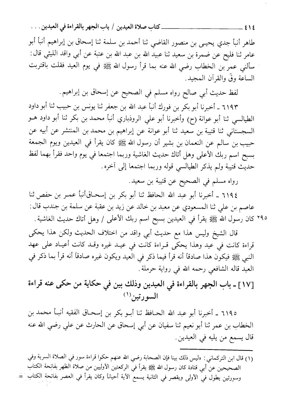 6195 - أَخْبَرَنَا أَبُو عَبْدِ اللهِ الْحَافِظُ، ثنا أَبُو بَكْرِ بْنُ إِسْحَاقَ الْفَقِيهُ، أنبأ مُحَمَّدُ بْنُ الْخَطَّابِ بْنِ عُمَرَ، ثنا أَبُو نُعَيْمٍ، ثنا سُفْيَانُ، عَنْ أَبِي إِسْحَاقَ، عَنِ الْحَارِثِ، عَنْ عَلِيٍّ رَضِيَ اللهُ عَنْهُ قَالَ: §" يُسْمِعُ مَنْ يَلِيهِ فِي الْعِيدَيْنِ "