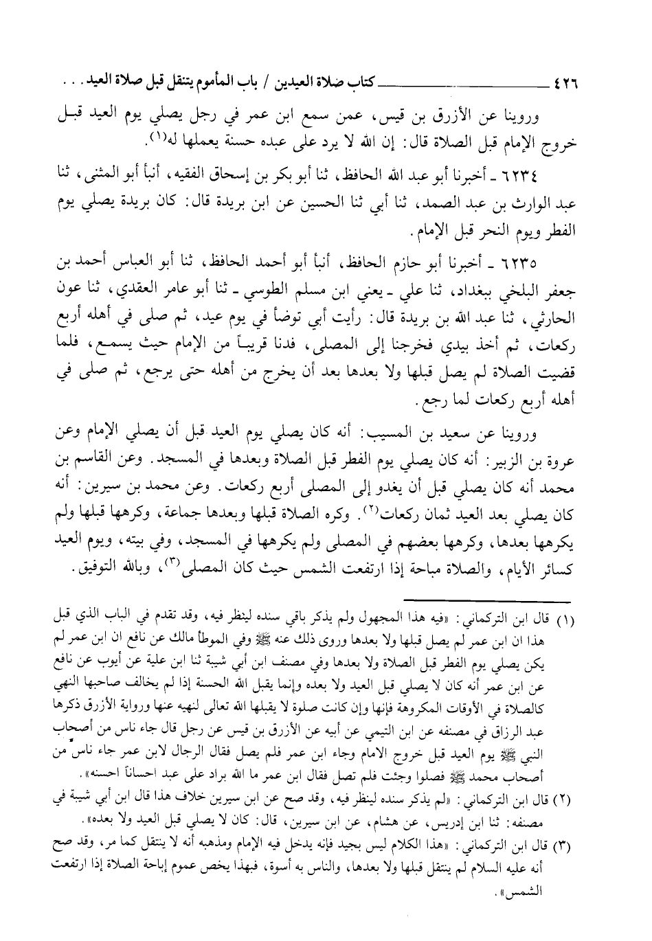 6234 - أَخْبَرَنَا أَبُو عَبْدِ اللهِ الْحَافِظُ، ثنا أَبُو بَكْرِ بْنُ إِسْحَاقَ الْفَقِيهُ، أنبأ أَبُو الْمُثَنَّى، ثنا عَبْدُ الْوَارِثِ بْنُ عَبْدِ الصَّمَدِ، ثنا أَبِي، ثنا الْحُسَيْنُ، عَنِ ابْنِ بُرَيْدَةَ قَالَ: §" كَانَ بُرَيْدَةُ يُصَلِّي يَوْمَ الْفِطْرِ وَيَوْمَ النَّحْرِ قَبْلَ الْإِمَامِ "