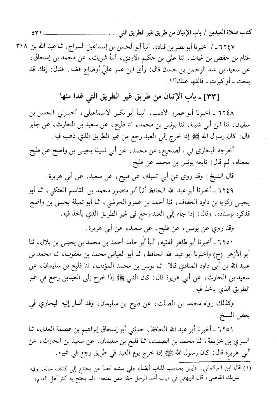 6250 - أَخْبَرَنَا أَبُو طَاهِرٍ الْفَقِيهُ، أنبأ أَبُو حَامِدٍ أَحْمَدُ بْنُ مُحَمَّدِ بْنِ يَحْيَى بْنِ بِلَالٍ , ثنا أَبُو الْأَزْهَرِ، ح وَأَخْبَرَنَا أَبُو عَبْدِ اللهِ الْحَافِظُ، ثنا أَبُو الْعَبَّاسِ مُحَمَّدُ بْنُ يَعْقُوبَ , ثنا مُحَمَّدُ بْنُ عُبَيْدِ اللهِ بْنِ أَبِي دَاوُدَ الْمُنَادِي قَالَا: ثنا يُونُسُ بْنُ مُحَمَّدٍ الْمُؤَدِّبُ، ثنا فُلَيْحُ بْنُ سُلَيْمَانَ، عَنْ سَعِيدِ بْنِ الْحَارِثِ، عَنْ أَبِي هُرَيْرَةَ قَالَ: §" كَانَ النَّبِيُّ صَلَّى اللهُ عَلَيْهِ وَسَلَّمَ إِذَا خَرَجَ إِلَى الْعِيدَيْنِ رَجَعَ فِي غَيْرِ الطَّرِيقِ الَّذِي يَأْخُذُ فِيهِ ". وَكَذَلِكَ رَوَاهُ مُحَمَّدُ بْنُ الصَّلْتِ عَنْ فُلَيْحِ بْنِ سُلَيْمَانَ , وَقَدْ أَشَارَ إِلَيْهِ الْبُخَارِيُّ فِي بَعْضِ النُّسَخِ