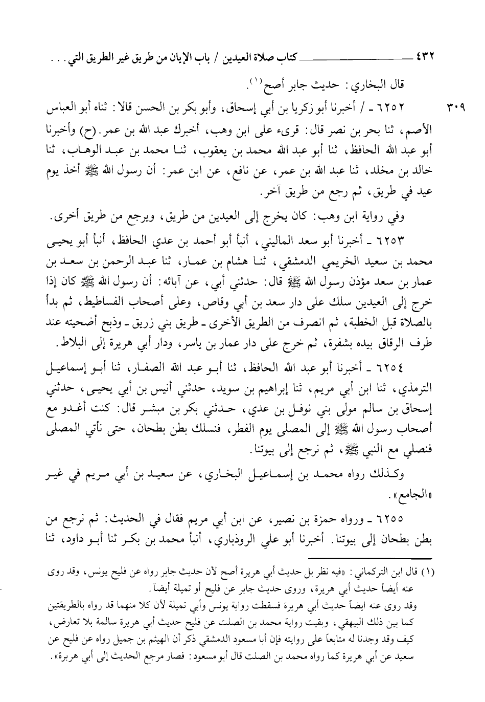 6252 - أَخْبَرَنَا أَبُو زَكَرِيَّا بْنُ أَبِي إِسْحَاقَ، وَأَبُو بَكْرِ بْنُ الْحَسَنِ قَالَا: ثنا أَبُو الْعَبَّاسِ الْأَصَمُّ , ثنا بَحْرُ بْنُ نَصْرٍ قَالَ: قُرِئَ عَلَى ابْنِ وَهْبٍ أَخْبَرَكَ عَبْدُ اللهِ بْنُ عُمَرَ، ح وَأَخْبَرَنَا أَبُو عَبْدِ اللهِ الْحَافِظُ، ثنا أَبُو عَبْدِ اللهِ مُحَمَّدُ بْنُ يَعْقُوبَ , ثنا مُحَمَّدُ بْنُ عَبْدِ الْوَهَّابِ، ثنا خَالِدُ بْنُ مَخْلَدٍ، ثنا عَبْدُ اللهِ بْنُ عُمَرَ، عَنْ نَافِعٍ، عَنِ ابْنِ عُمَرَ، أَنَّ رَسُولَ اللهِ صَلَّى اللهُ عَلَيْهِ وَسَلَّمَ §" أَخَذَ يَوْمَ عِيدٍ فِي طَرِيقٍ ثُمَّ رَجَعَ مِنْ طَرِيقٍ آخَرَ ". وَفِي رِوَايَةِ ابْنِ وَهْبٍ " كَانَ يَخْرُجُ إِلَى الْعِيدَيْنِ مِنْ طَرِيقٍ وَيَرْجِعُ مِنْ طَرِيقٍ أُخْرَى "